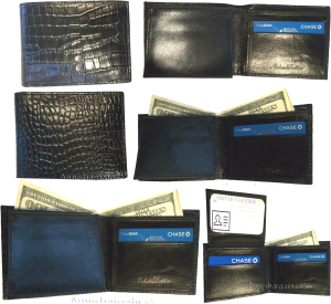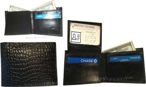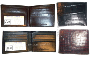 $19.95crocodile skin printed leather man's bi fold wallet 2 bill pockets 6 card ID.Description:This is a very stylish crocodile skin printed leather mans wallet with an easy-in-out ID case. It has 2 billfolds and 6 card slots. This wallet would make a great gift for that special someone that has it all, or treat your...