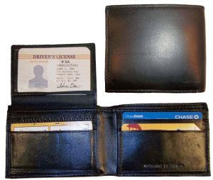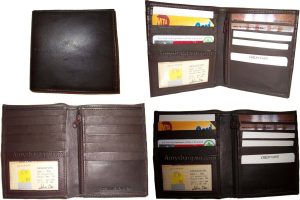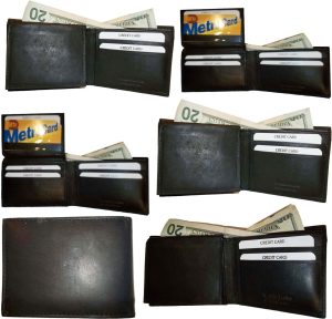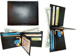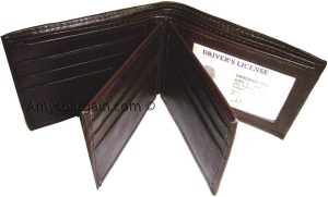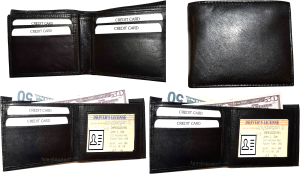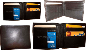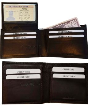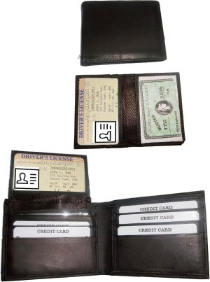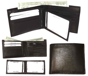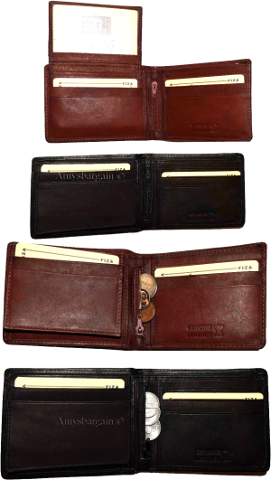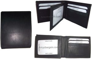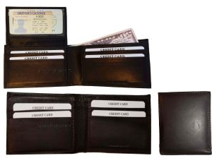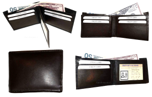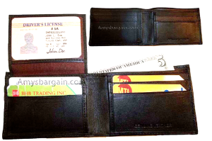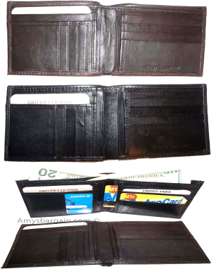 $12.95Man's Leather Wallet Black Brown bifold wallet 2 bill slots 9 credit card apace.Descriptions:This fine quality wallet would make a nice gift for the special someone that has it all, or treat yourselves to it.This man's wallet offers: an ID window for convenience.Item Details:Item: Leather man's wallet.Material: fine grain Leather.2 Billfold compartments.1 hidden zip billfold...