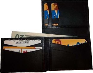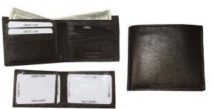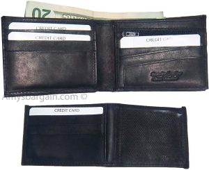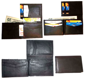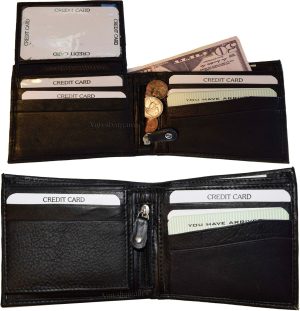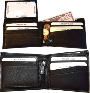 $12.95Leather 2-in-1 Man's Wallet 9 Card Space 2 ID window coin purse 2.5 bill packets.Description:This leather men's bi-fold wallet has 6 card spaces, a mini zip pocket and 2 suede lined billfolds. Act now! They won't last.Item Details:Item: Leather man's wallet.Material: Fine grain Leather.6 card spaces.2 Billfold pockets.Dimensions: 4.25 X 3.25 inches.Color: Black. View all images...