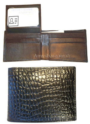 $24.95Crocodile Skin Printed brown leather man's bi fold wallet 2 bil slots 6 card ID.Description:This is a very stylish crocodile skin printed leather mens wallet with an easy-in-out ID case. It has 2 billfolds and 6 card slots. This wallet would make a great gift for that special someone that has it all, or treat...