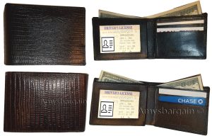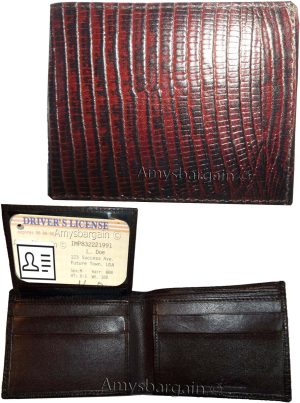 $19.95Italian Styled lizard Printed Leather man's bi fold wallet 2 bill slot 6 card ID.Description:This is a very stylish Italian styled lizard printed leather mans wallet with an easy-in-out ID case. It has 2 billfolds and 6 card slots. This wallet would make a great gift for that special someone that has it all, or...