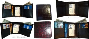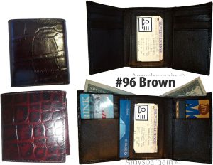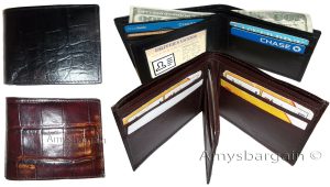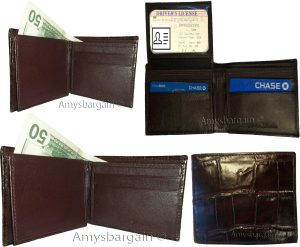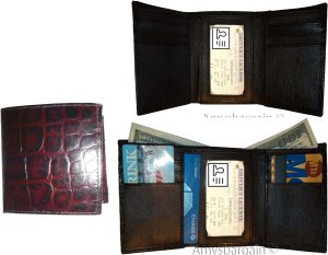 $19.95Man's Trifold Leather wallet Brown Crocodile skin Printed 2 billfolds 9 cards.Description:Item: Man's trifold crocodile skin printed leather wallet.Materiel: Top grain Leather.6 Card spaces.3 Under-card card spaces.1 ID window.2 Bill fold pockets.Color: Brown.: Durable top grain leather.Size when closed: 4.25 X 3.25 X .50 inches.This is a very stylish Italian styled crocodile printed leather men’s...