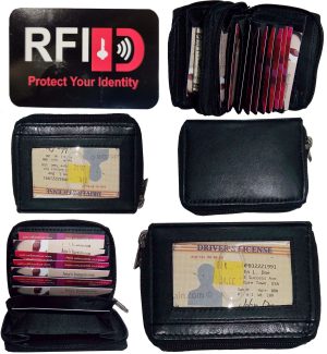 $11.95Leather Wallet Multiple card accordion style leather 2 Zip Credit Card ID Holder.Description:RFID Zip Around Leather Business Card ID Credit card picture case 30 card slots.Description:Protect your cards and IDs against RFID scanners; secure your cards from identity thieves. buy RFID cases for yourselves and your friends.This is a RFID Genuine Leather Wallet.This protective RFID...