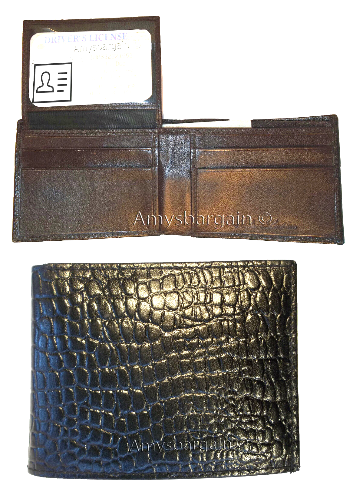 Description:This is a very stylish crocodile skin printed leather mans wallet with an easy-in-out ID case. It has 2 billfolds and 6 card slots. This wallet would make a great gift for that special someone that has it all, or treat your selves to its qualities.It has an easy in-and-out ID window, 6 card spaces and 2 lined bill fold pockets.Item Details: