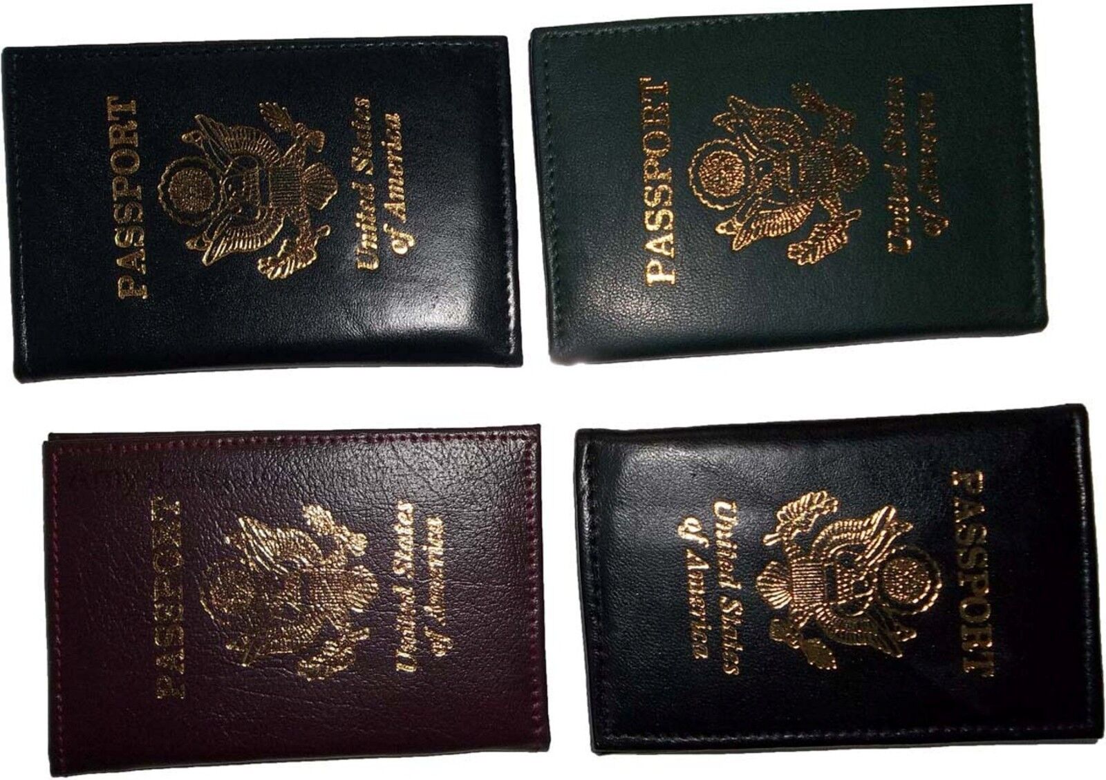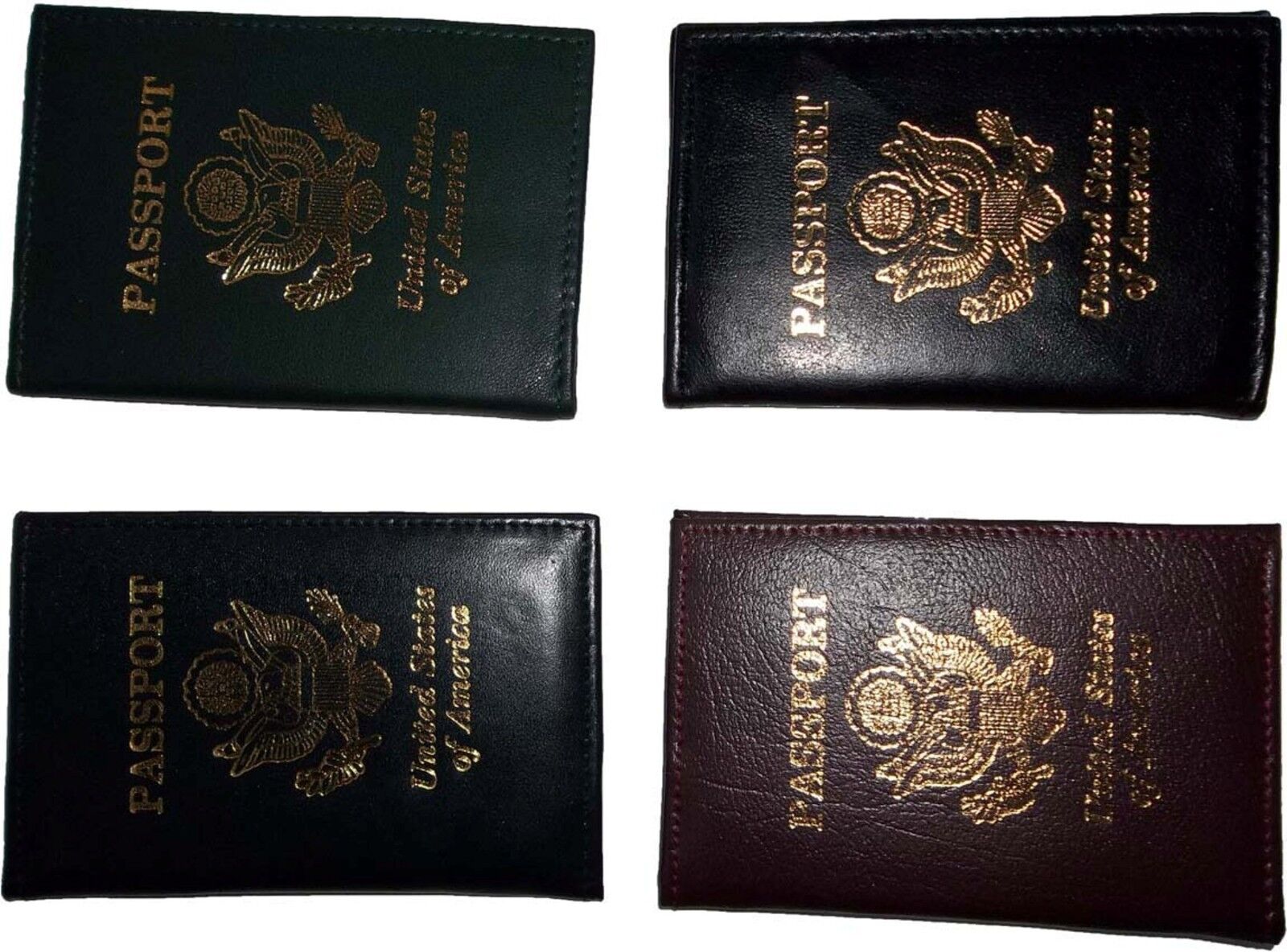 Description:This listing is for 4 assorted passport cases.This one is a favorite among tourists and non-tourists alike. It is a USA leather passport case with built in bank card spaces.This wonderful passport case is an exceptional value at this price!It will not last.Item Details: