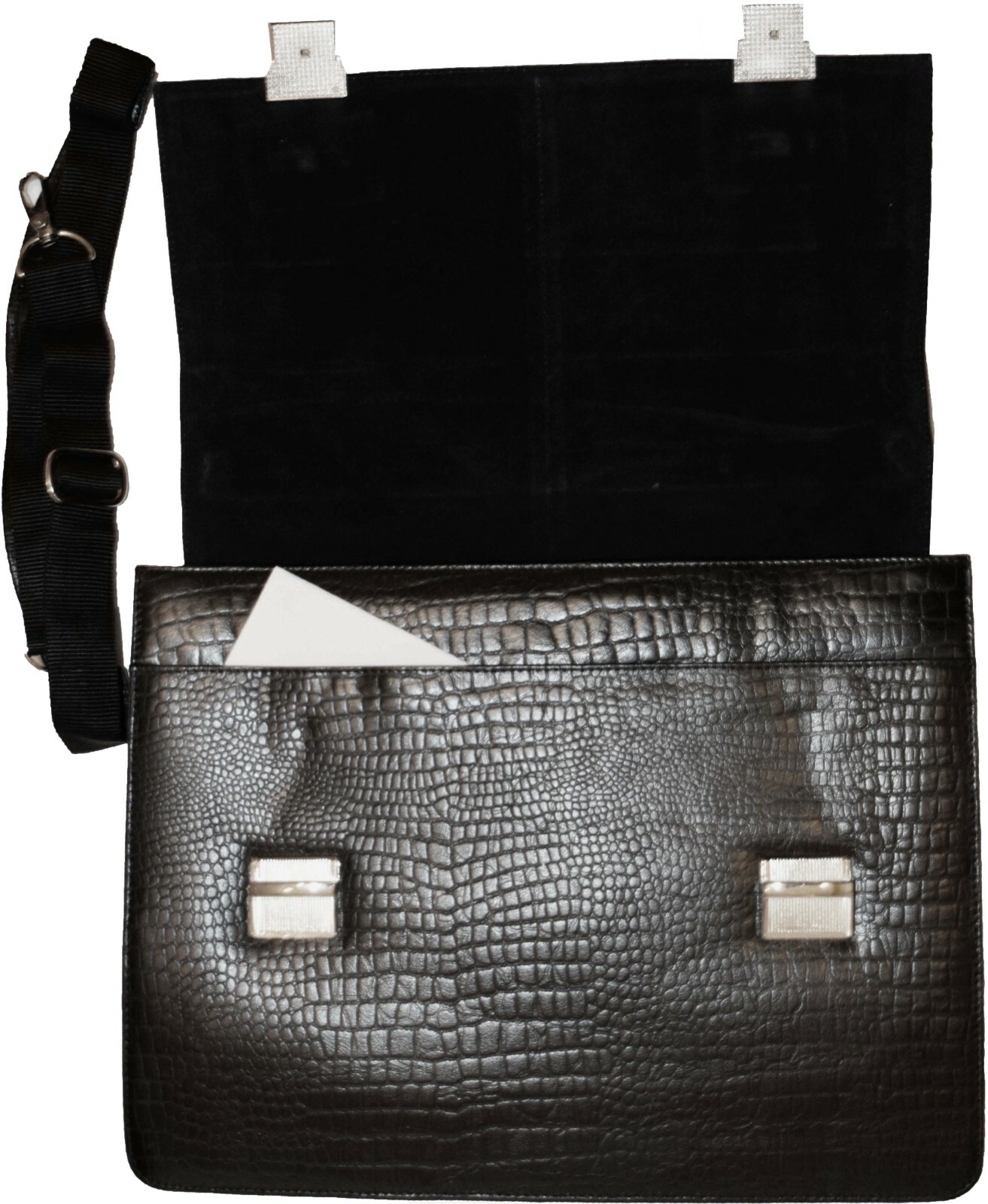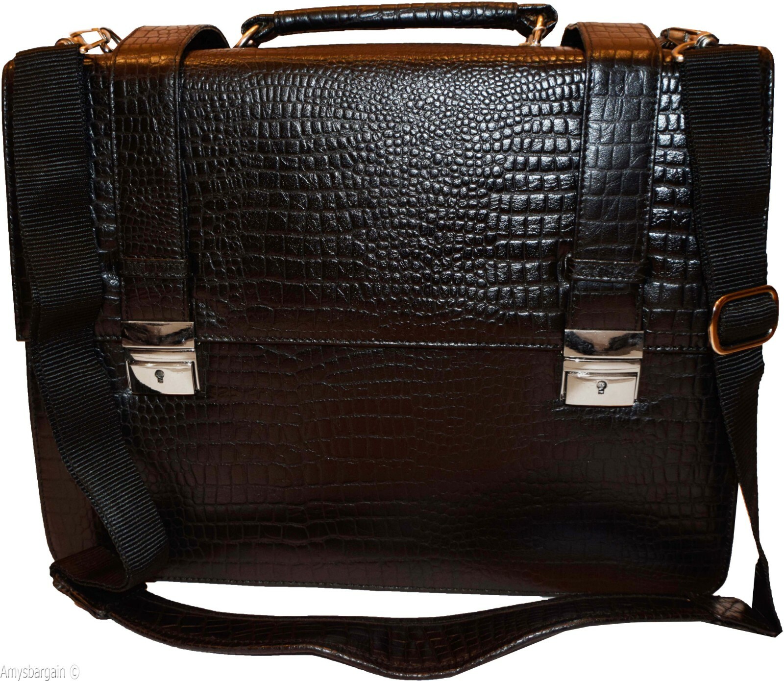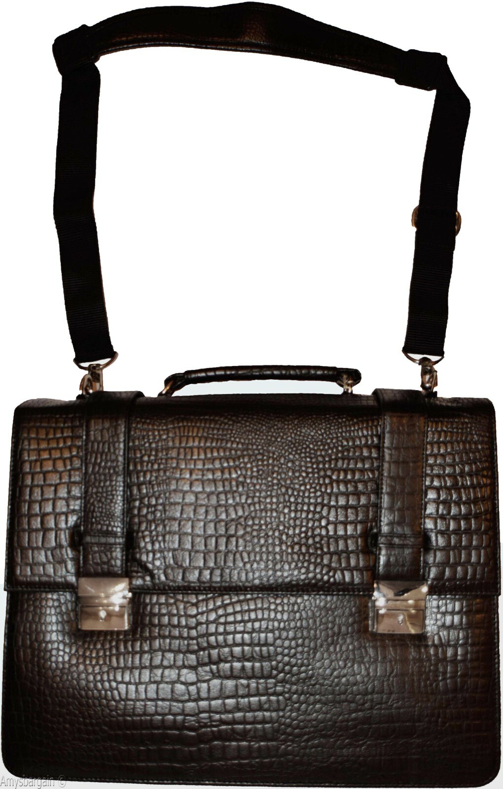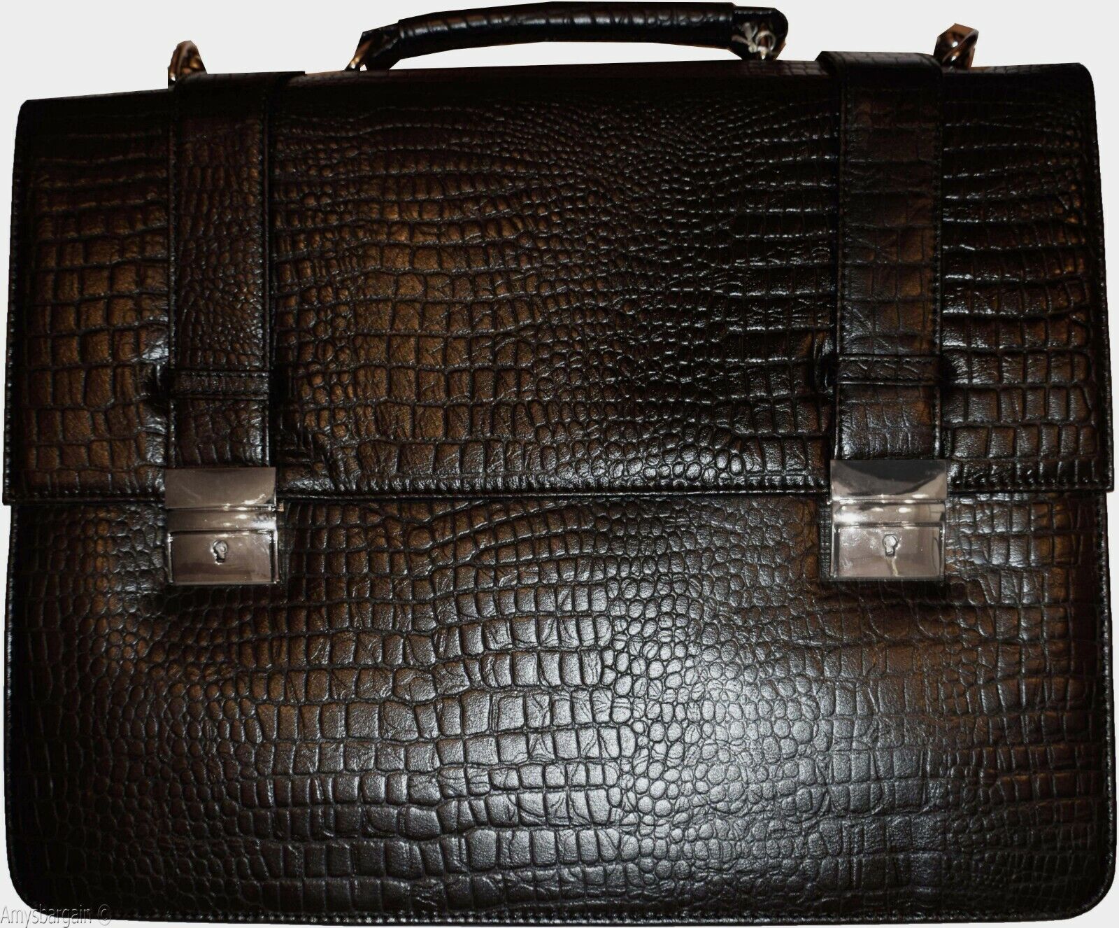 Leather Briefcase, Crocodile skin printed leather, solid silver chrome hardware, Adjustable Straps, Size: 16 X 12 X 5½ inches.