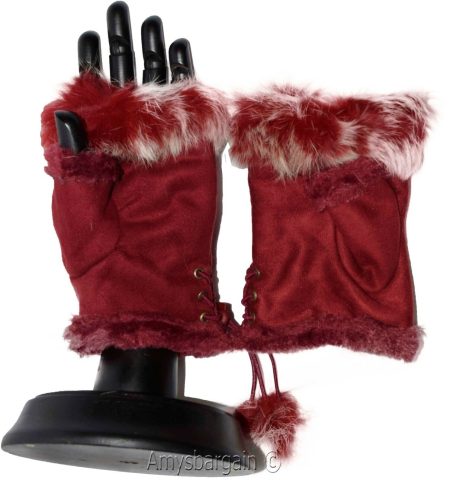 These warm beautiful and stylish finger-less gloves are made out of faux suede and faux rabbit fur.