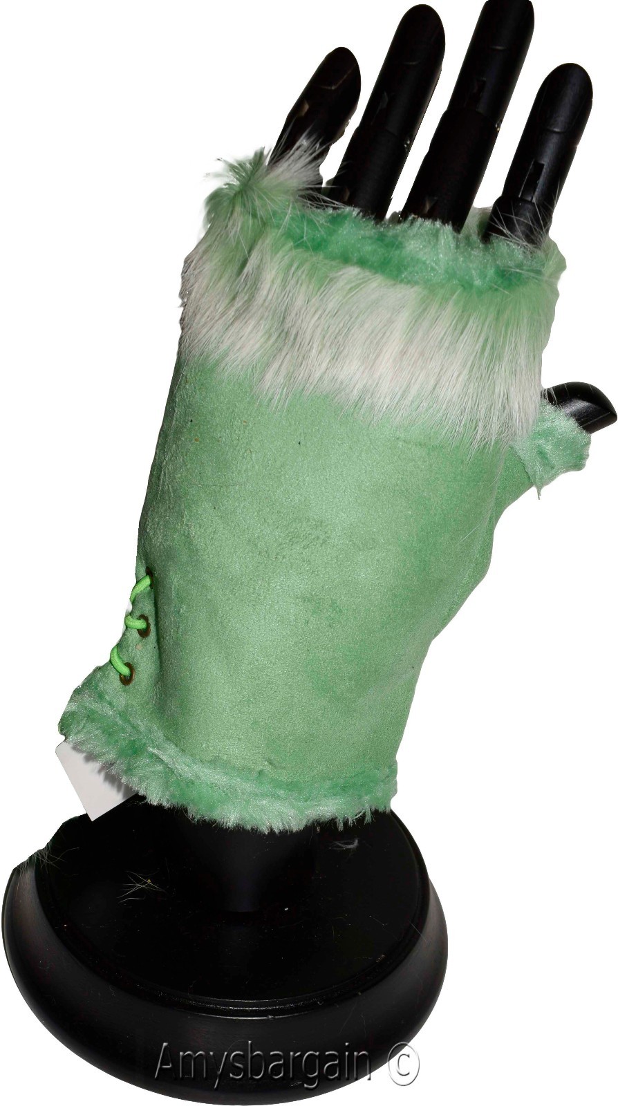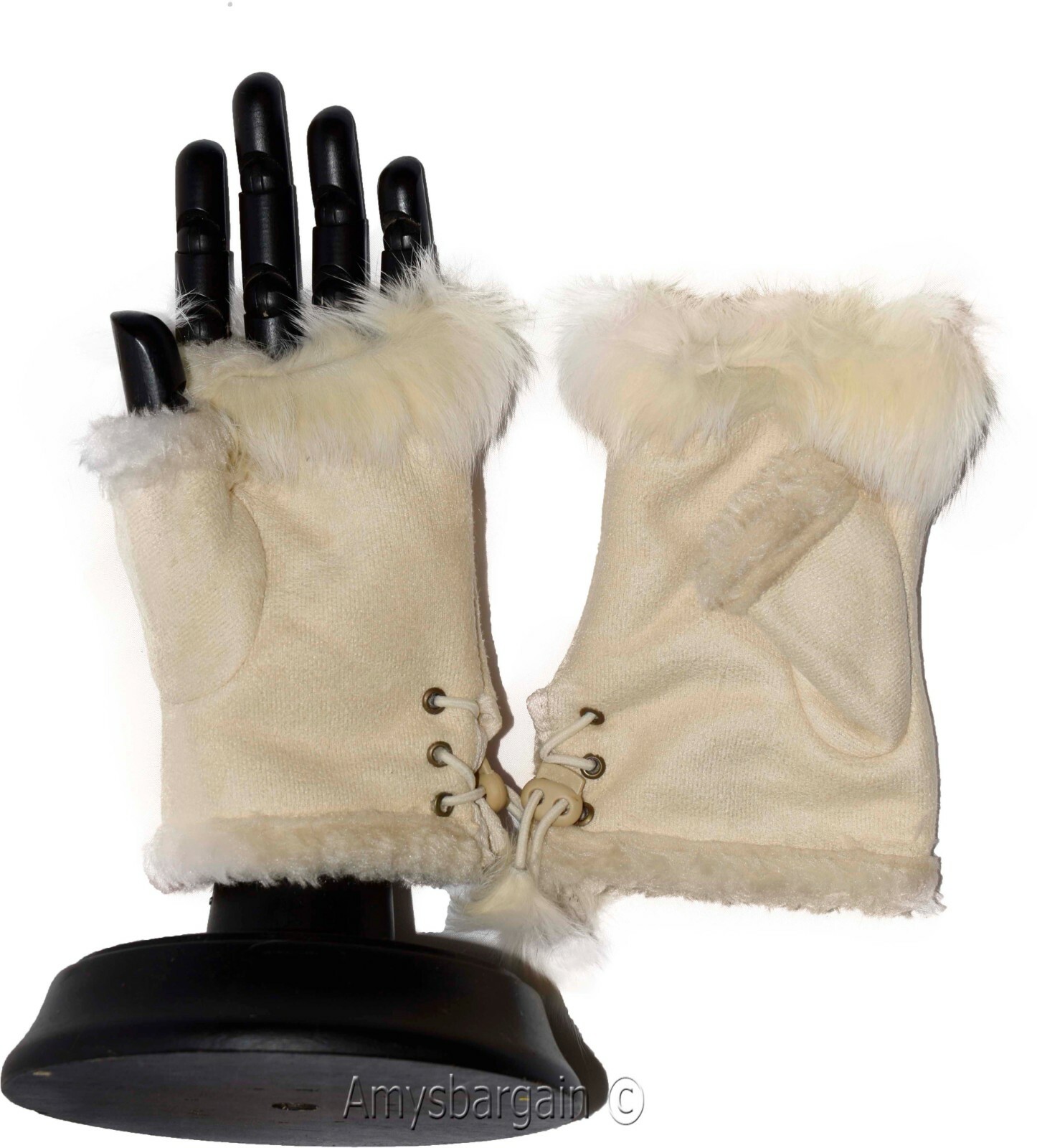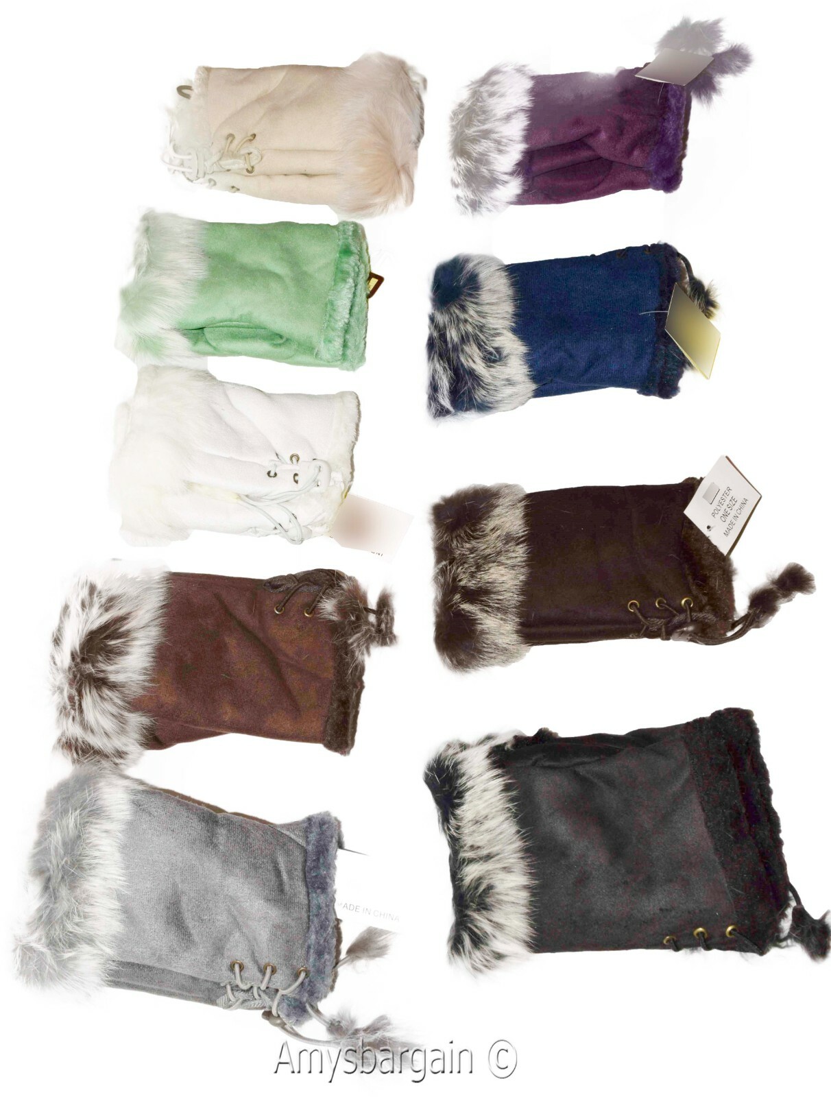 These warm beautiful and stylish finger-less gloves are made out of faux suede and faux rabbit fur.