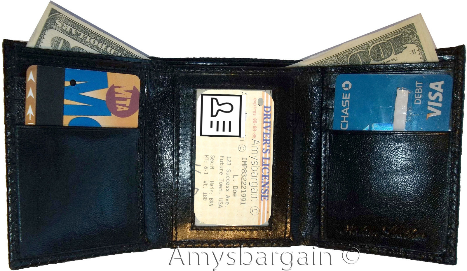 man's black trifold wallet new style woven printed leather wallet.Description:Buy the lot and save a lot!This is a very stylish woven printed leather men's wallet with an easy-in-out ID case. It has 2 billfolds and 9 card slots. This wallet would make a great gift idea. Or, treat yourselves to its qualities.It has an easy in-and-out ID window, 9 card spaces and 2 lined bill fold pockets.Item Details: