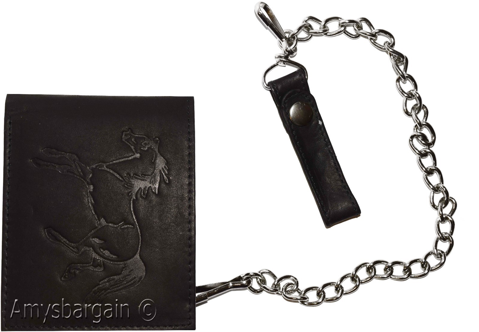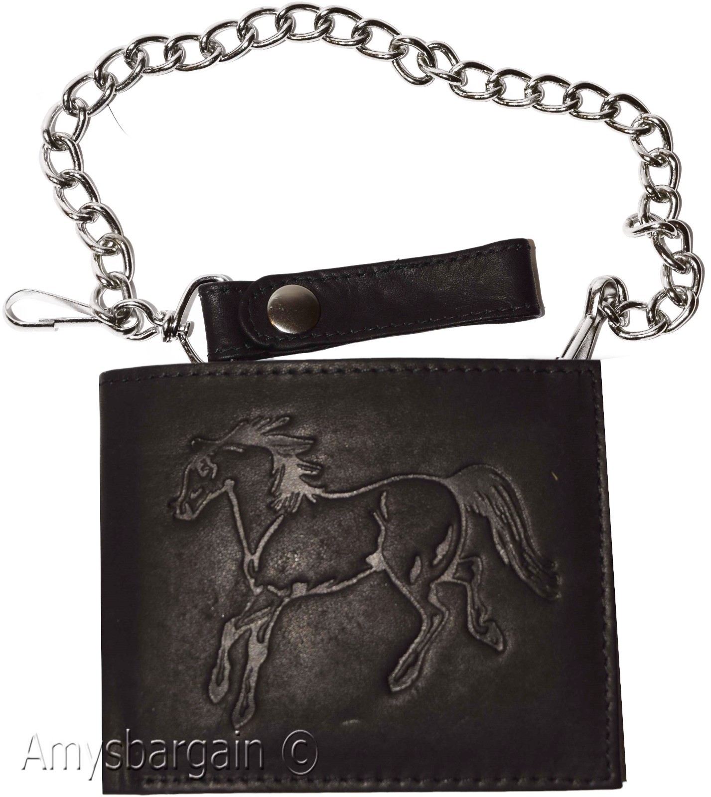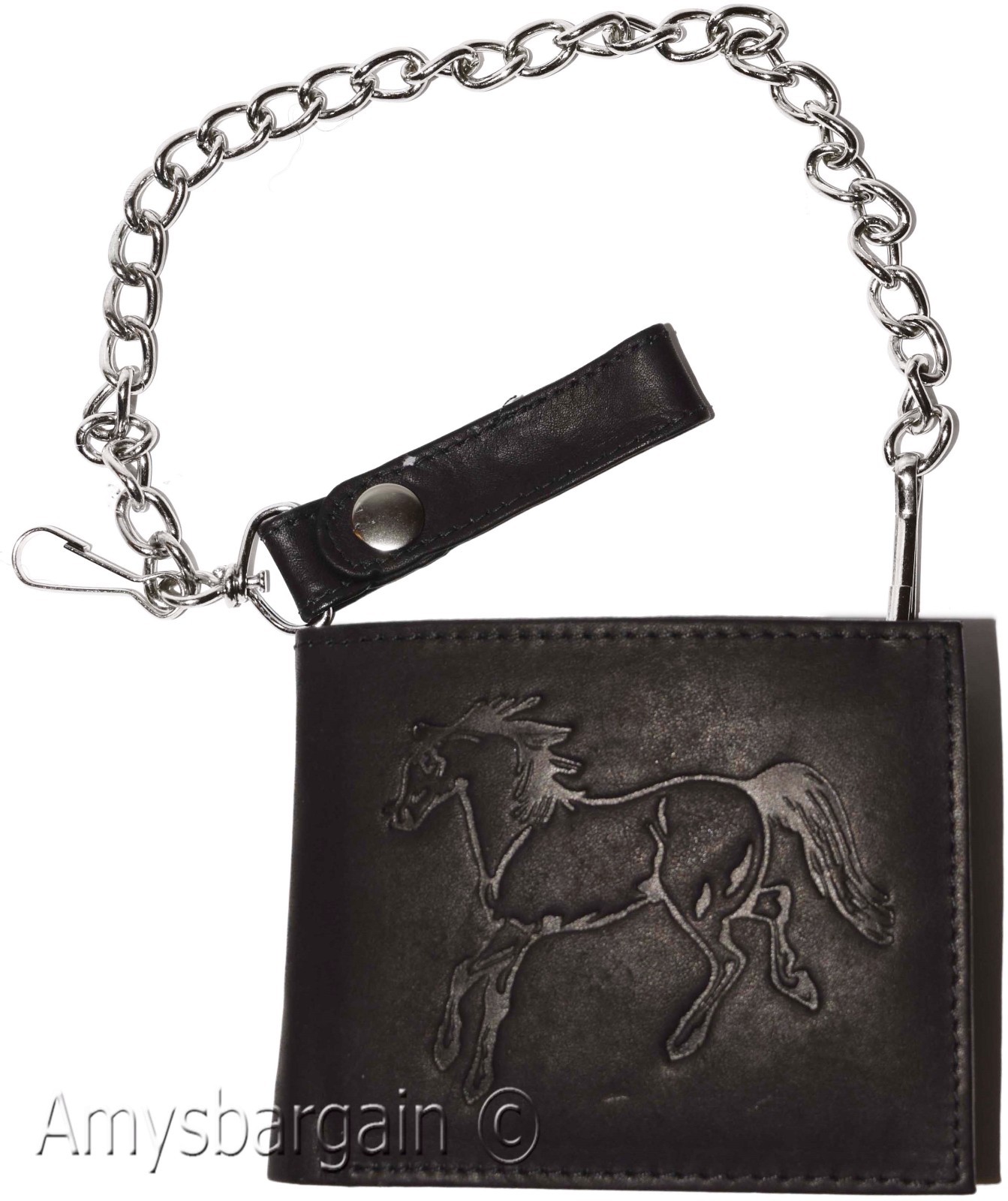 Bi-fold wallet has a snap on and off chain with an attached leather loop. The