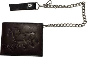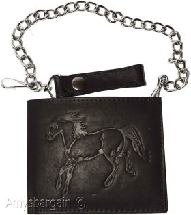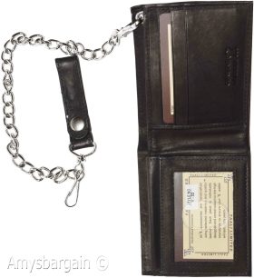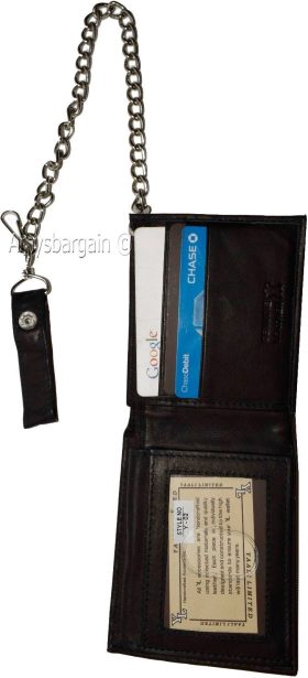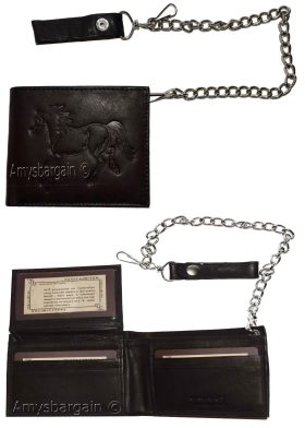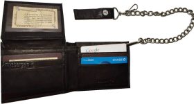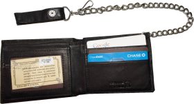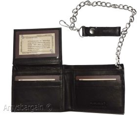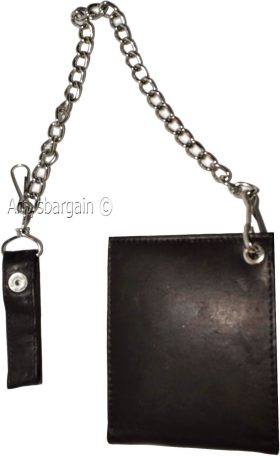 Lot of 2. Men's Chain Bifold Leather wallet, Motorcycle, Trucker, Biker wallet.Description:This durable leather Bi-fold wallet has a snap on and off chain with an attached leather loop. The easy snap on loop can be hooked on paints loops, for style.It can also be snapped on a motocycle, bike, or a buckle on a horse saddle for extra security and style.Moreover, the interior is suede lined.Fact: suede or leather lined wallets last twice as long as fabric lined wallets.Buy it now! only a few available at this price!Item Details:· Item: Leather men's chain Bi-fold wallet.· Material: Fine natural leather and suede.· Lining: Suede lined interior.· 2 large billfold pockets.· Detachable chain length: 14 inches.· 6 Credit card spaces.· 2 Under-card hidden card spaces.· 2 Transparent ID windows.· Dimensions: 4.50 x 3.50 inches.· Color: Black. View images please.Re-order number: Y02BY30.Manufacturers Suggested Retail Price (MSRP) $24.95 each.Buy it now it won't last!