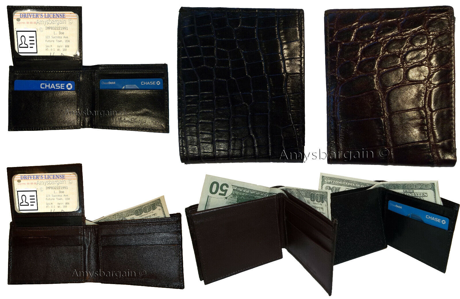 Lot of 2 New Crocodile Skin Printed Leather man's bi fold wallet 6 cards ID BNWT.Description:Buy the lot and save a lot!This is a very stylish crocodile skin printed leather mans wallet with an easy-in-out ID case. It has 2 billfolds and 6 card slots. This wallet would make a great gift for that special someone that has it all, or treat your selves to its qualities.It has an easy in-and-out ID window, 6 card spaces and 2 lined billfold pockets.Item Details: