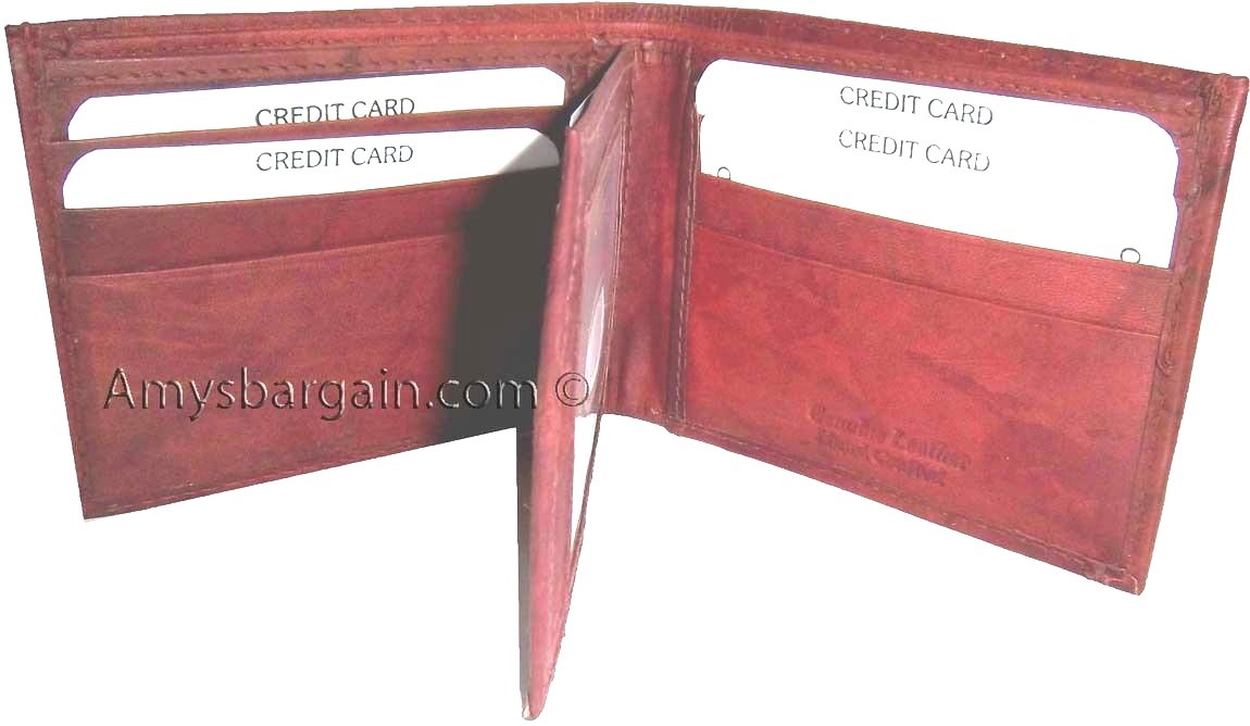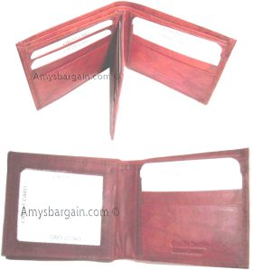 Description:This beautiful sued line interior top quality wallet has special features that are very practical. It would make an ideal gift for that special someone. Or, just treat yourselves to its qualities.It has an easy in-and-out ID window, 9 card spaces and 2 suede lined billfold compartments.Item Details:· Item: Leather man's wallet.· Material: Fine grain Leather.· Lining: Sued lined interior.· 9 card spaces· 2 Billfold compartments.· 1 ID window.· Quality: Top grain leather.· Dimensions: 4.25" x H 3.25 inches.· Color: Burgundy. View images please.Style #: 786CD.Buy it now it won't last!Manufacturers Suggested Retail Price (MSRP) $21.95. each.