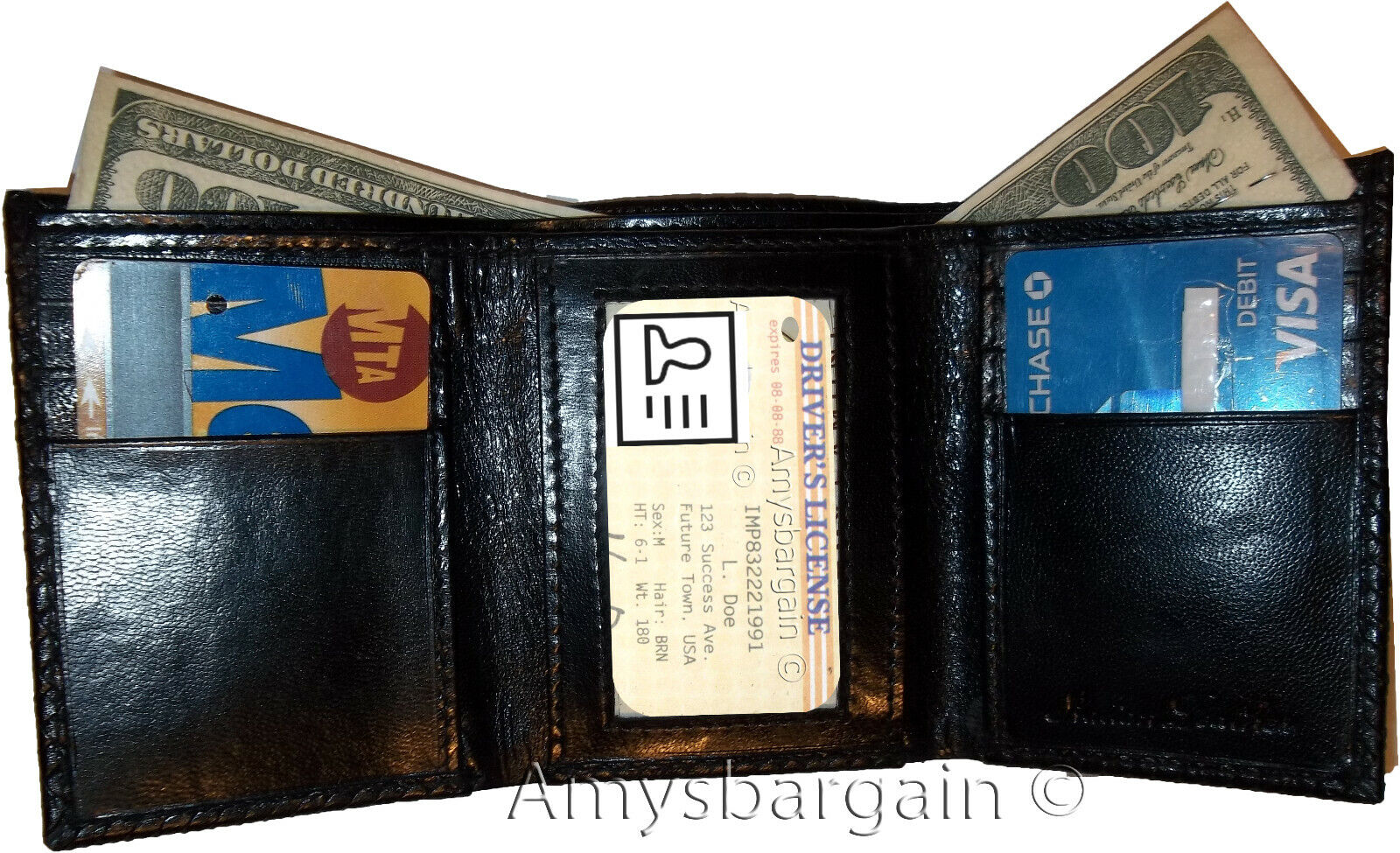 lot of 2 woven printed genuine leather man's black trifold wallet ID credit card
