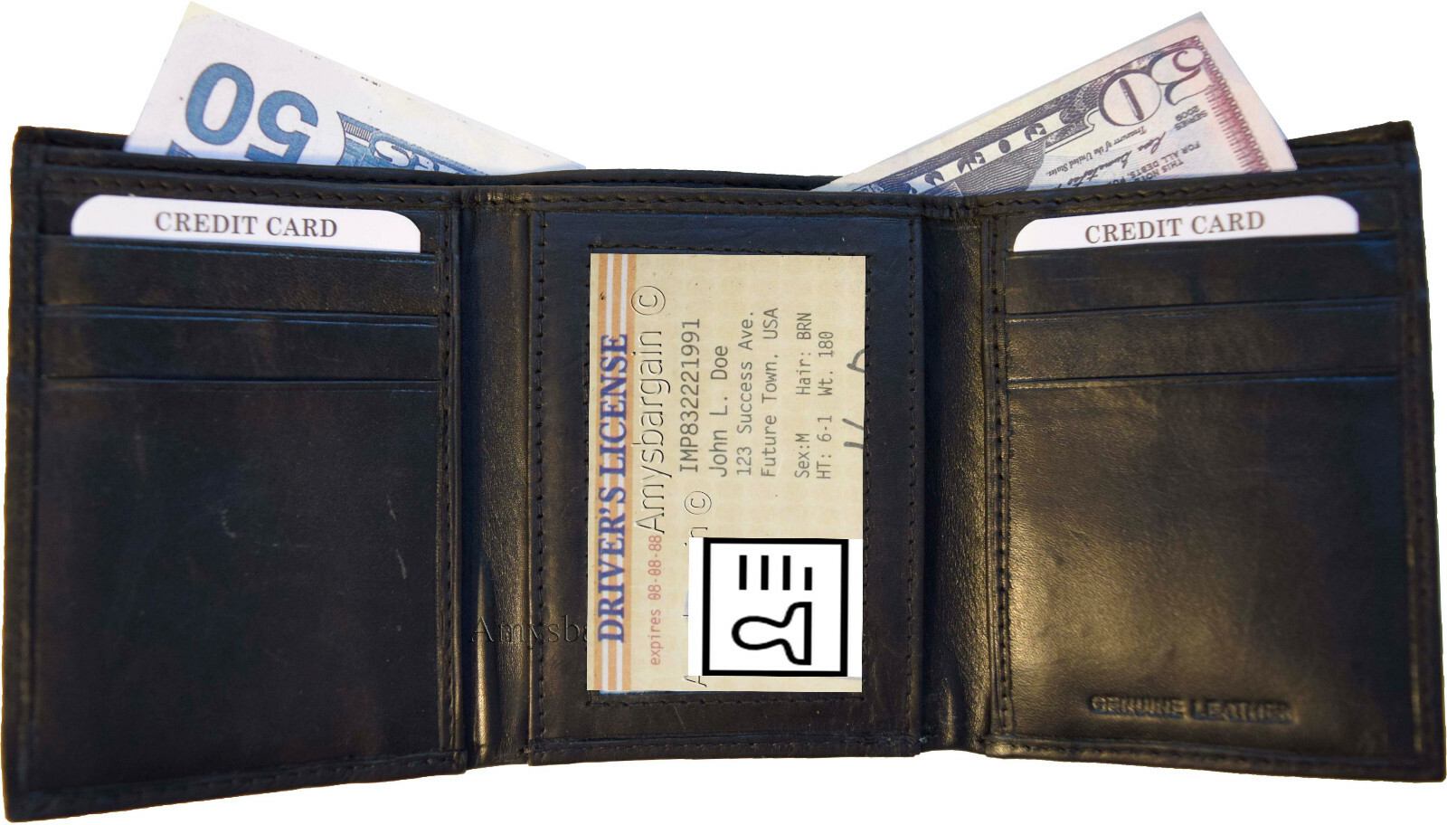 Description:This man's soft calf skin leather wallet would make a great gift for that special someone that has it all, or treat yourself to it.This trifold man's wallet is a full size wallet with ID window and 6 card spaces.Act now!Item Details: