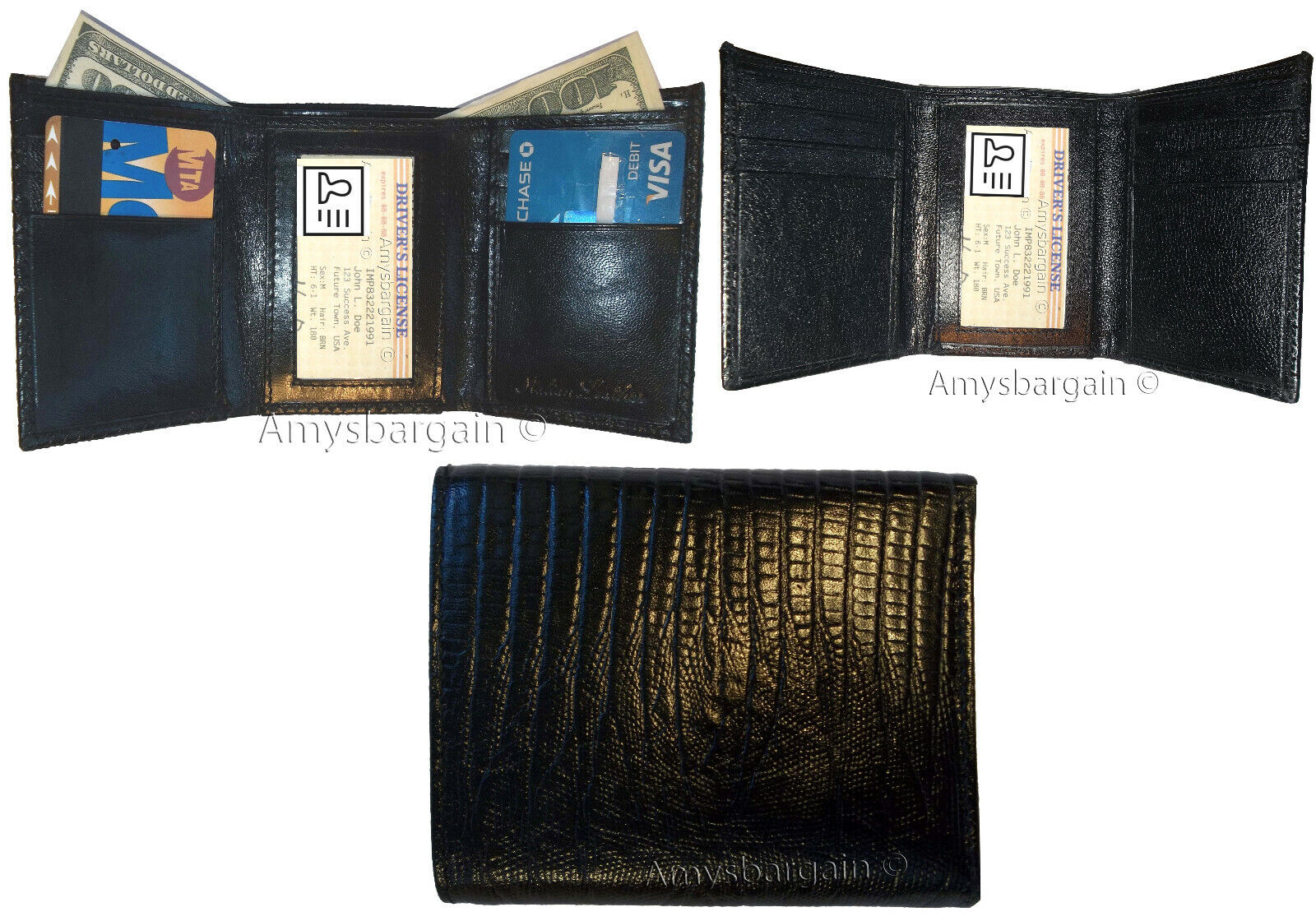 New Italian style Crocodile printed leather man's trifold wallet. 2 billfolds, 1 ID window 9 credit Card space.