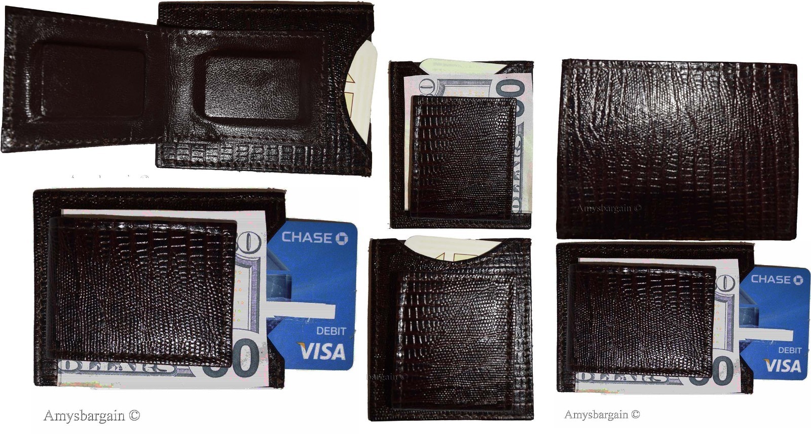 Lot of 6 Brown Lizard skin printed leather money clip Unbranded money clip new.Description:This very beautiful lizard skin printed leather easy to use, stylish, small and light weight money clip would make a great gift item. Or, treat your selves to it.It fits all national and international currencies.Item Details: