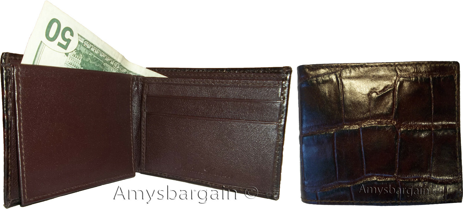 Crocodile Printed Skin Leather, 2 Bill fold pockets., 1 Easy in-and-out ID window.