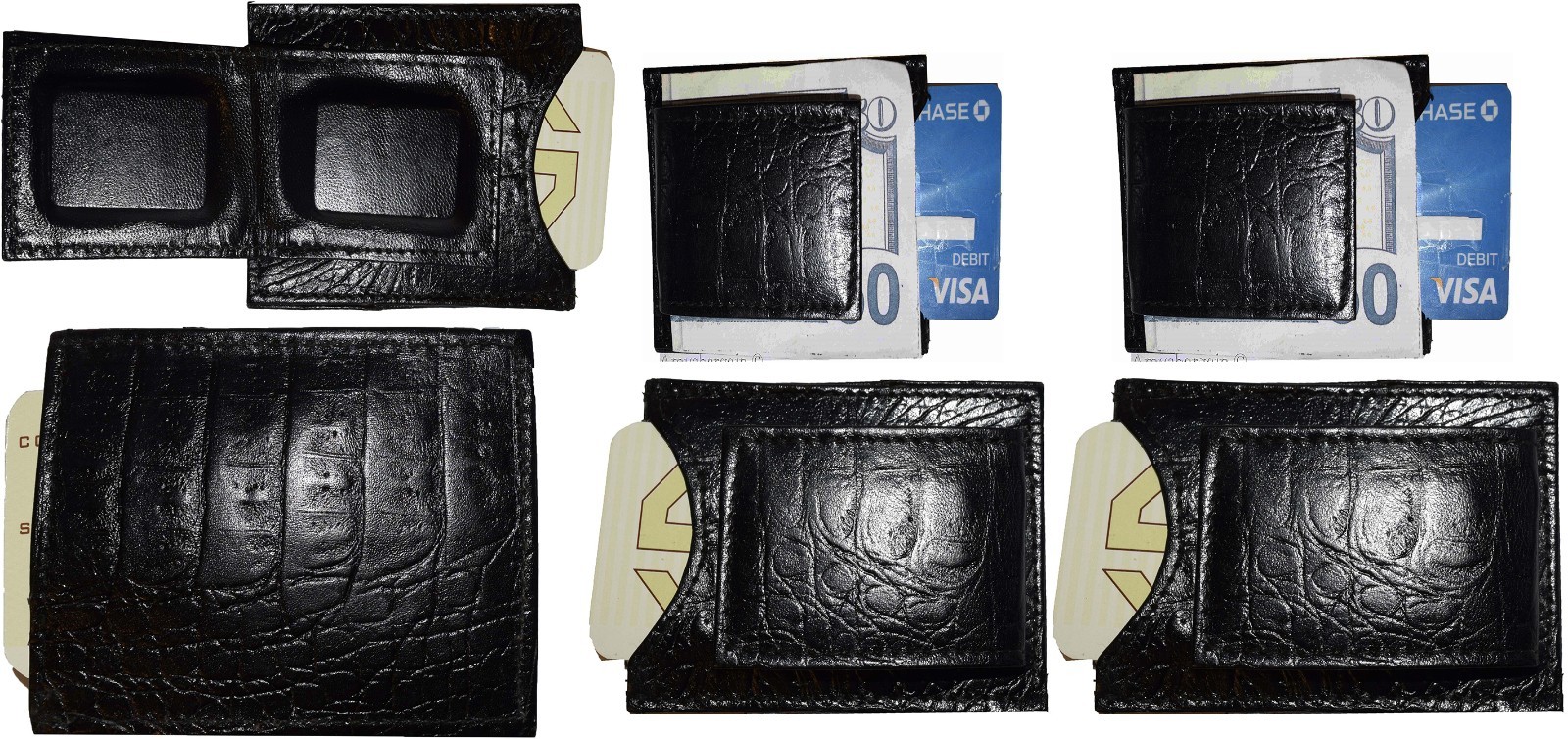 Lot of 6 Crocodile skin printed leather money clip Black Bifold Billfold. BR New.Description:This very beautiful black crocodile skin printed leather money clip is easy to use. It is stylish, small and lightweight. This money clip would make a great gift item. Or, treat yourselves to it.It fits all types of national and international currencies.Item Details: