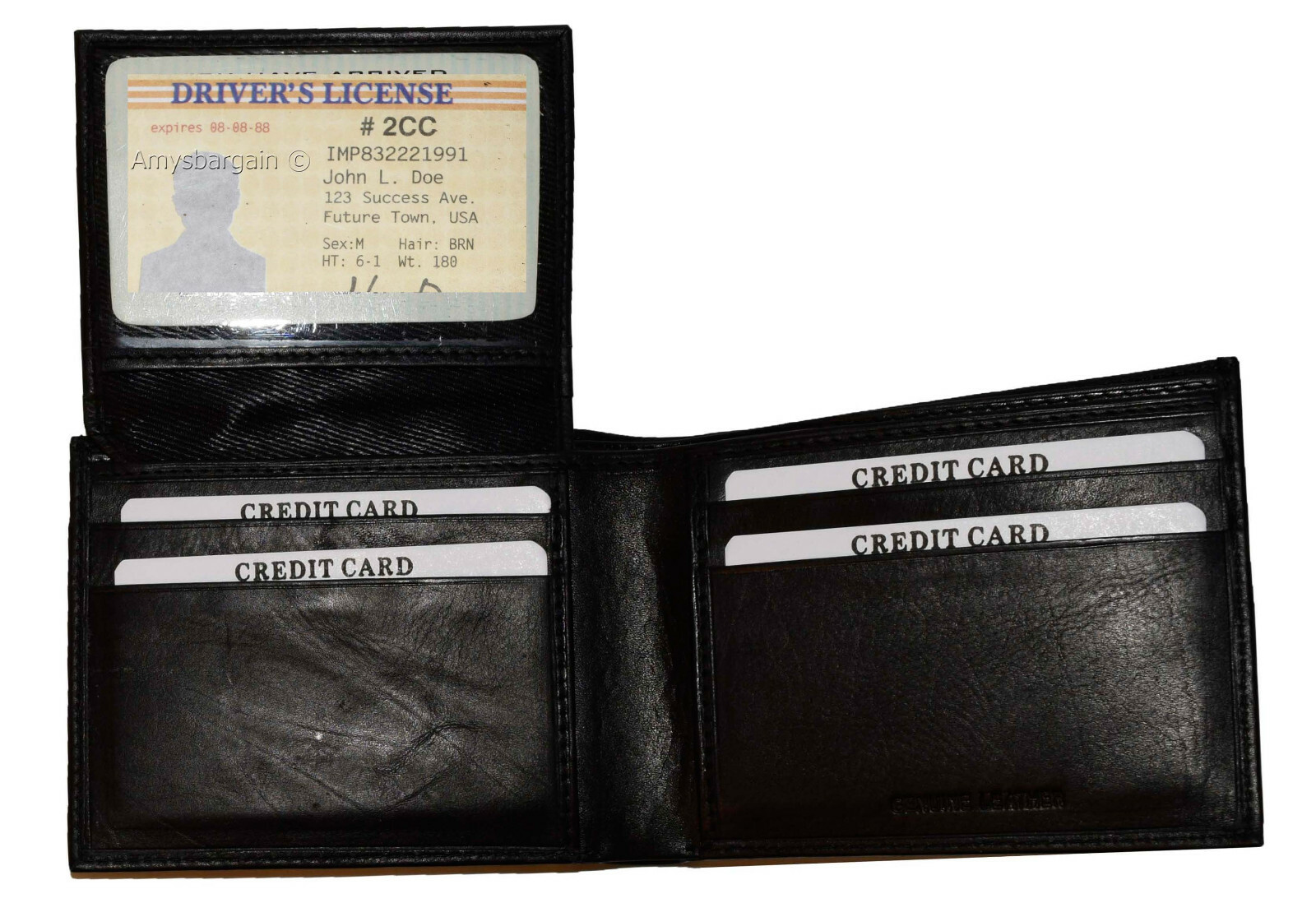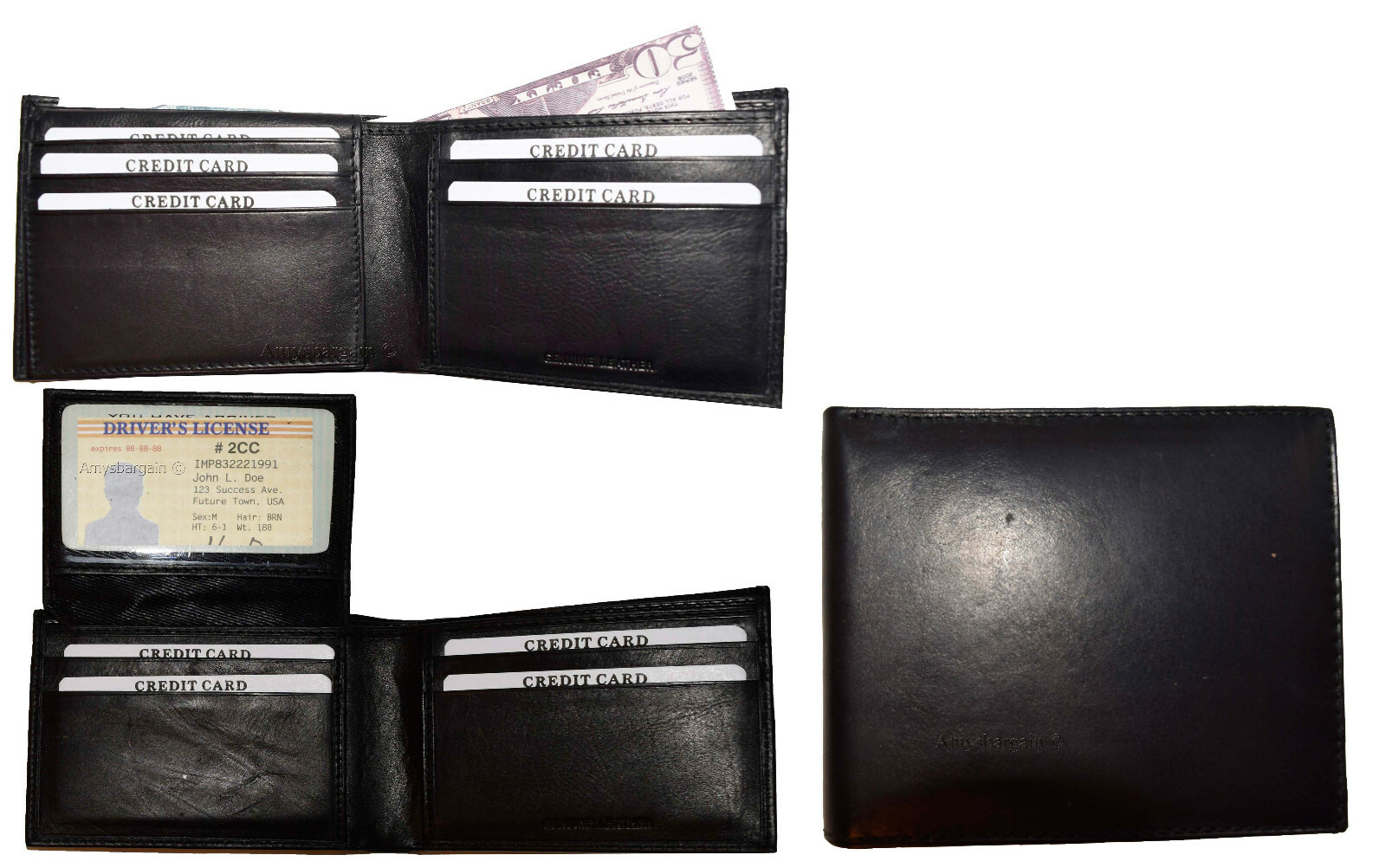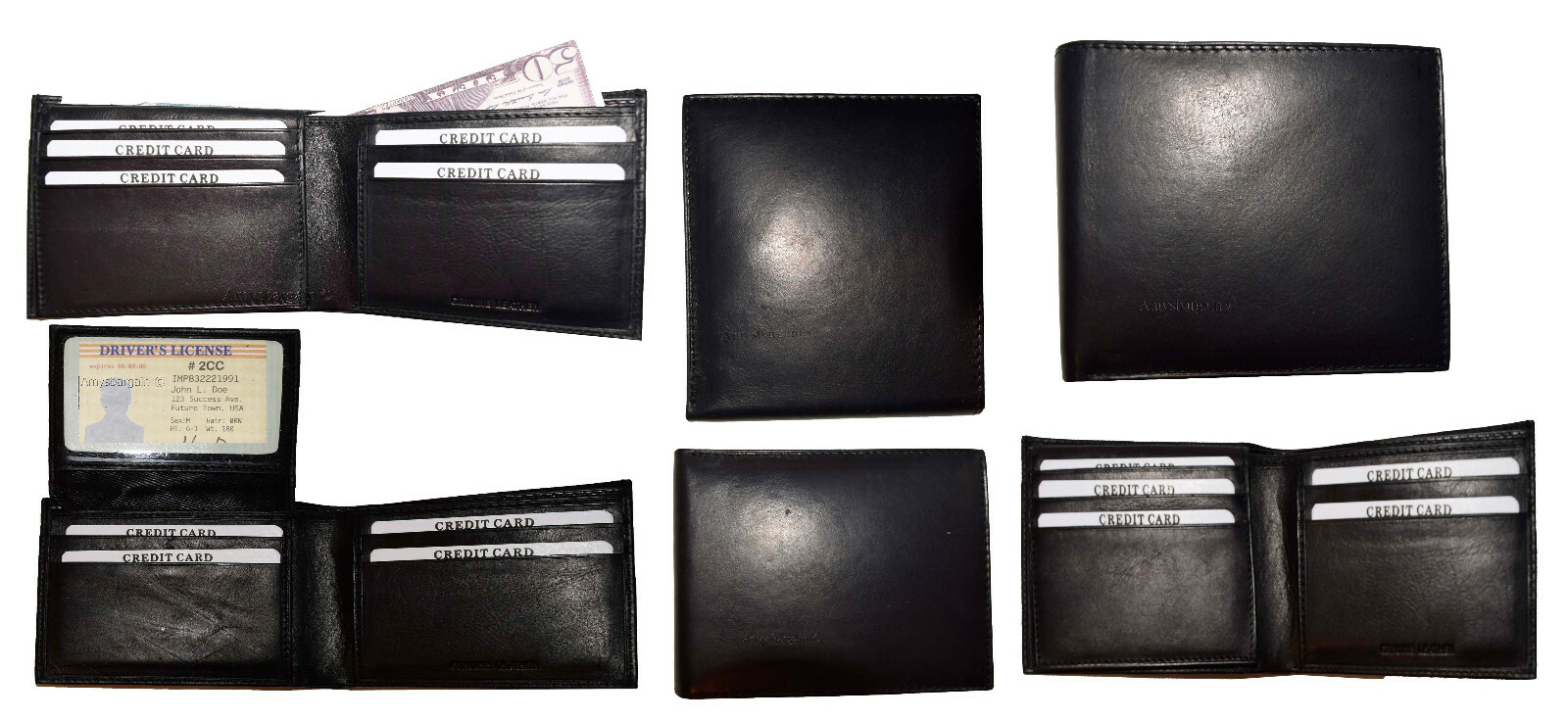 lot of 6 men's black bifold new calfskin leather 2 bill slots 7 card 1 id window.