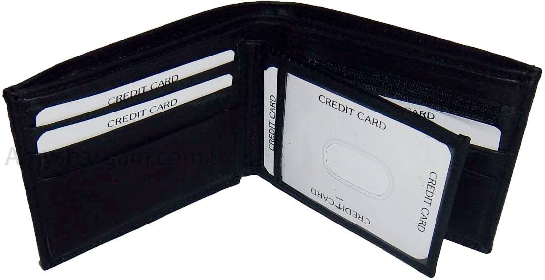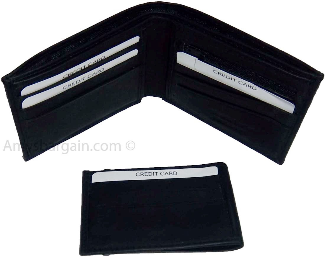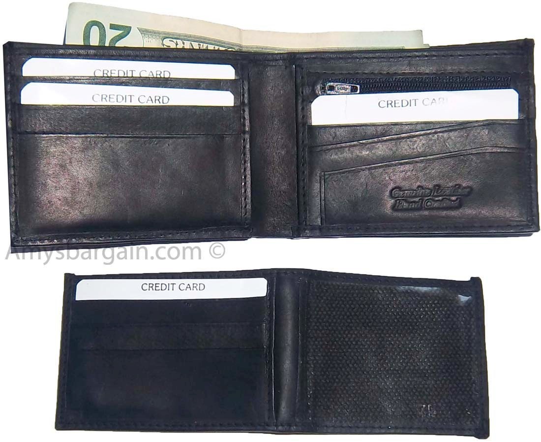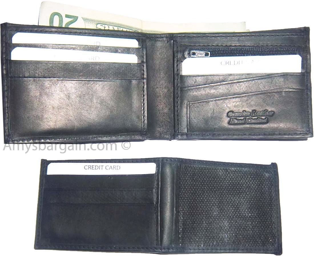 Description:This leather men's bi-fold wallet has 6 card spaces, a mini zip pocket and 2 suede lined billfolds.Act now! They won't last.Item Details: