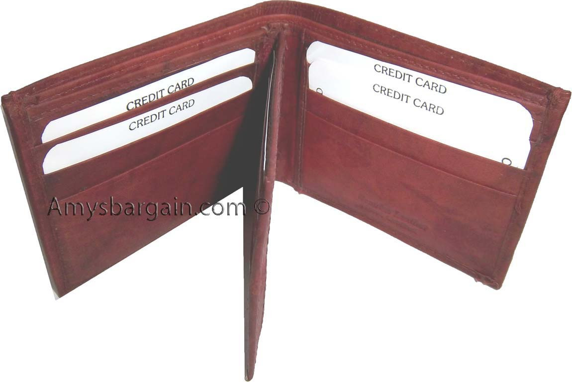 Description:This beautiful sued line interior top wallet has special features that are very practical. It would make an ideal gift for that special someone. Or, just treat yourselves to its qualities.It has an easy in-and-out ID window, 9 card spaces and 2 suede lined billfold compartments.Item Details:· Item: Leather man's wallet.· Material: Fine grain Leather.· Lining: Sued lined interior.· 9 card spaces· 2 Billfold compartments.· 1 ID window.· : Top grain leather.· Dimensions: 4.25" x H 3.25 inches.· Color: Cognac. View images please.Style #: 786CD.Buy it now it won't last!Manufacturers Suggested Retail Price (MSRP) $21.95. each.