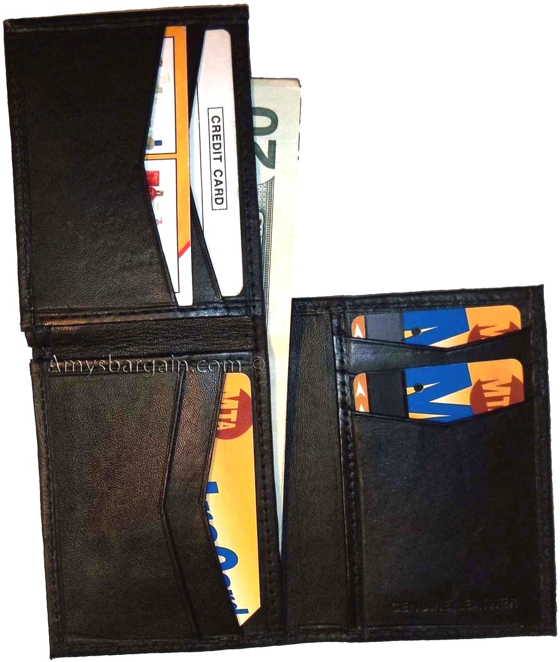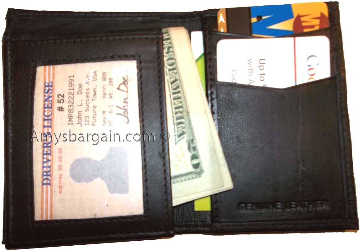 This trifold man's wallet has a transparent window, 7 card spaces. A bill fold compartment. Not to mention, 3 secretly hidden card spaces.