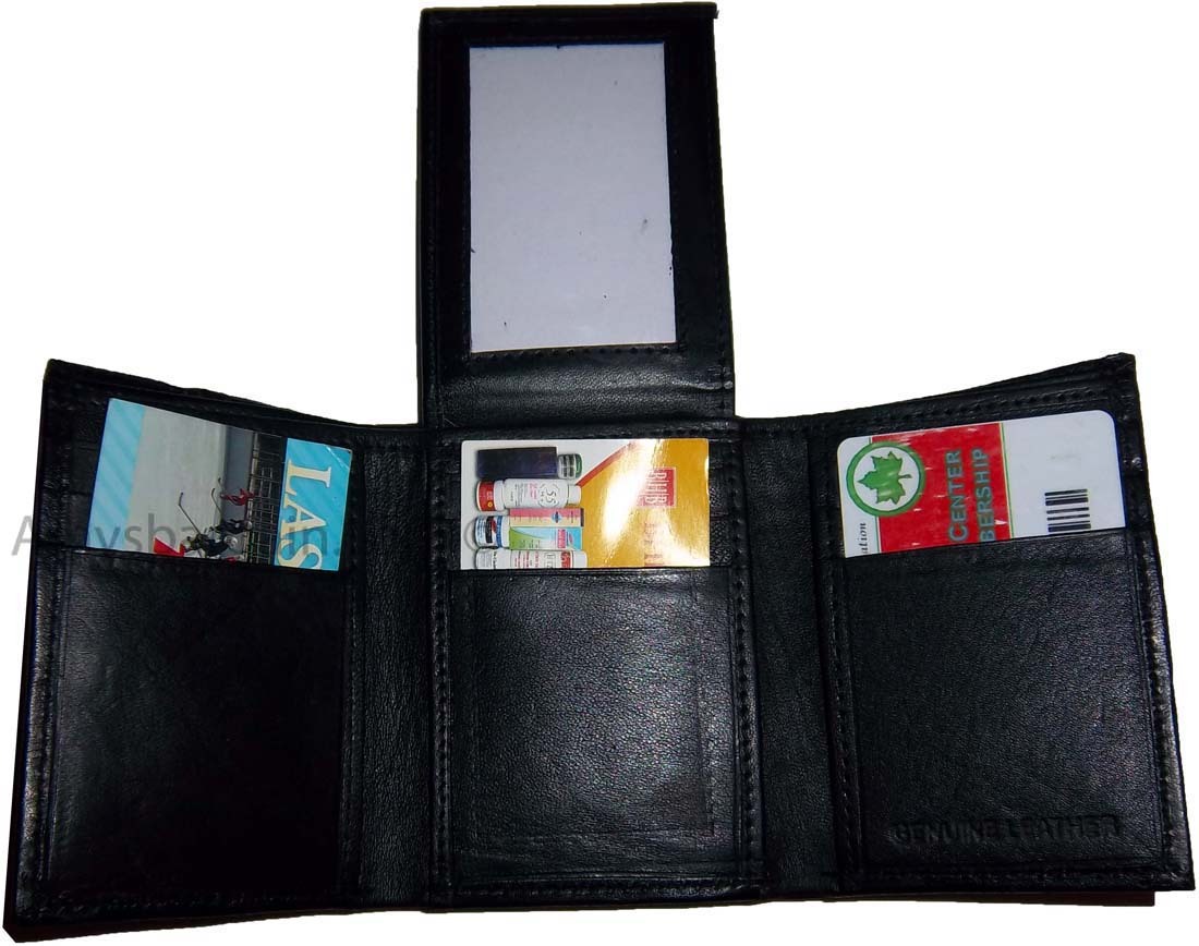 trifold leather wallet id window 9 card 2 bill spaces new one.Description:This is another great leather wallet.This tri fold men's wallet has a transparent windows, 9 card spaces. 2 billfold compartments. Not to mention, 3 secretly hidden card spaces.Item Details: