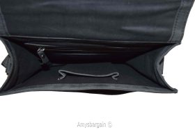 This Nubuck cowhide leather bag features a full flap and one convenient zip easy access rear pocket. It has an interior display for credit cards, pan and pencil, and a large sell phone pocket. It also has a 58" adjustable canvas reinforced sturdy shoulder strap.