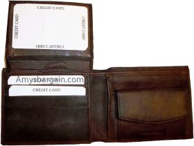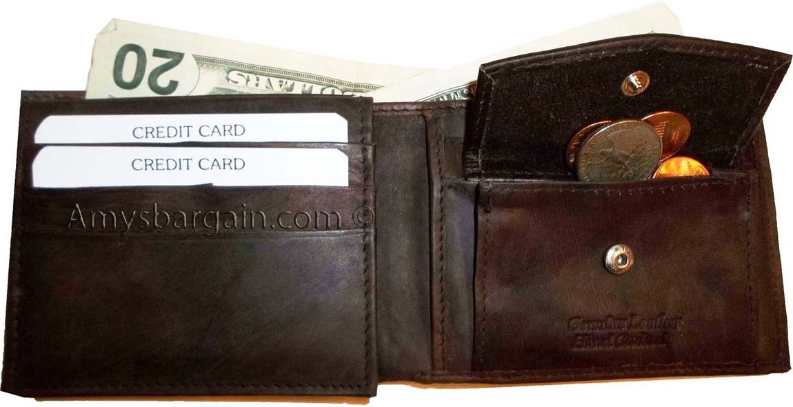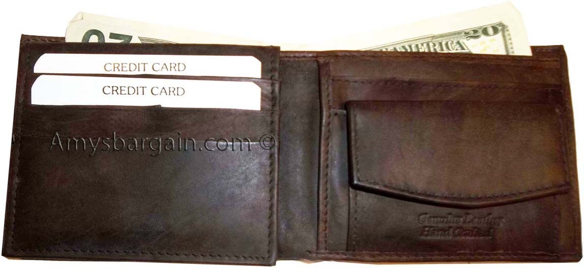 Description:This is a cow hide leather mans wallet with a built-in change purse. This wallet would make a great gift for that special someone that has it all, or treat your selves to its qualities.This man's wallet offers: a change purse for convenience.It has an easy in-and-out ID window, 7 card spaces and 2 suede lined bill fold pockets.Item Details: