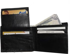 Description:This soft genuine leather Bi-fold men's wallet offers 12 credit card spaces. 2 billfold pockets, a 3rd zip billfold for bills or coins. Detachable piece with 2 transparent ID windows. It would make a great gift item, or treat yourselves to it.Buy it now! it will not last at this price!Item Details:· Item: Leather Men's Bifold wallet.· Material: genuine leather.· 2 Billfold pockets.· 3rd zip bill fold for bills or coins.· 1 Detachable piece with 2 transparent ID windows.· 12 Credit card spaces total.· 2 Under-card hidden card spaces.· Dimensions: (Closed): 4.50 X 3.50 inches.· Color: Black. View images please.· What's included? leather wallet. Bills, cards and other "Demo Items" are not included.Re-order number: 767Y30.Manufacturers Suggested Retail Price (MSRP) $24.95 each.Buy it now it won't last!