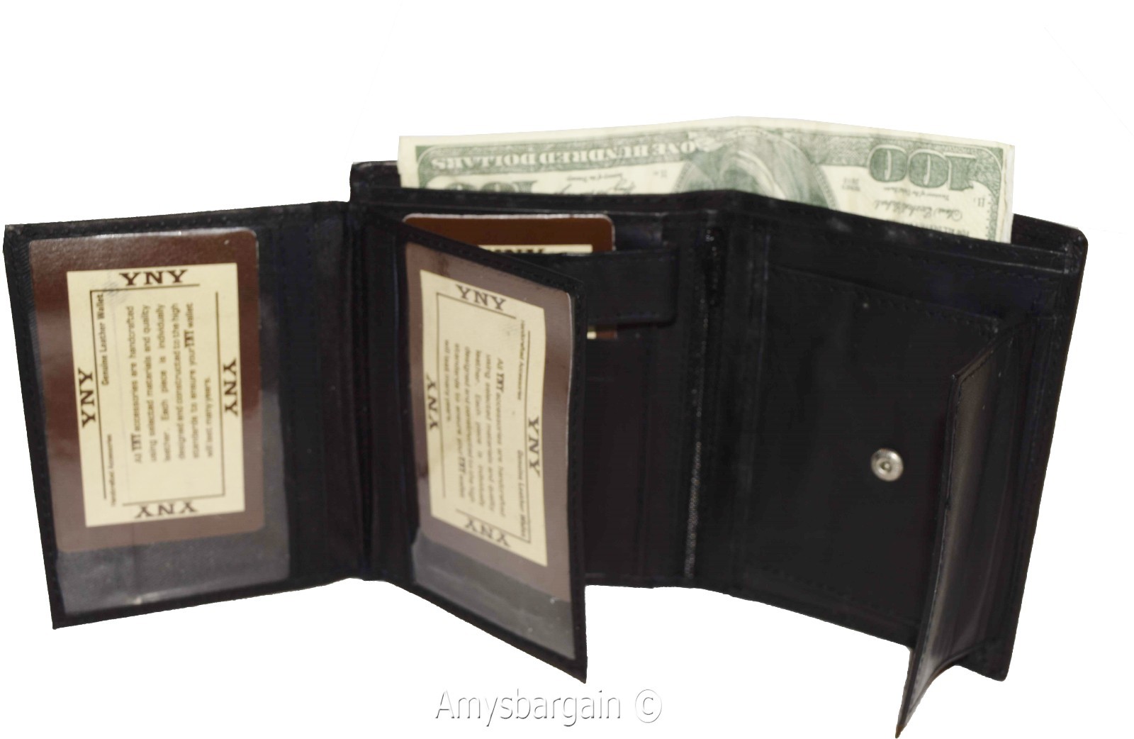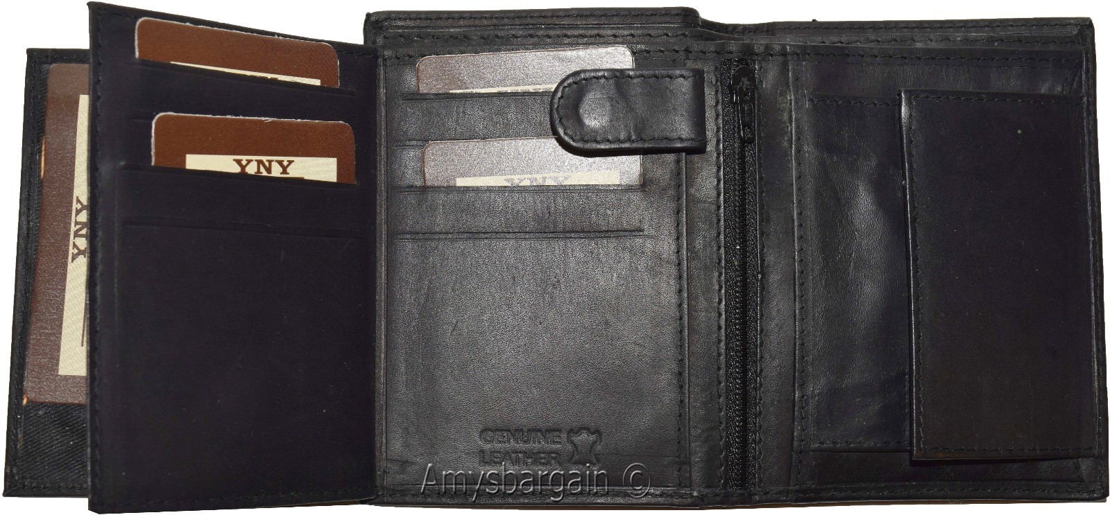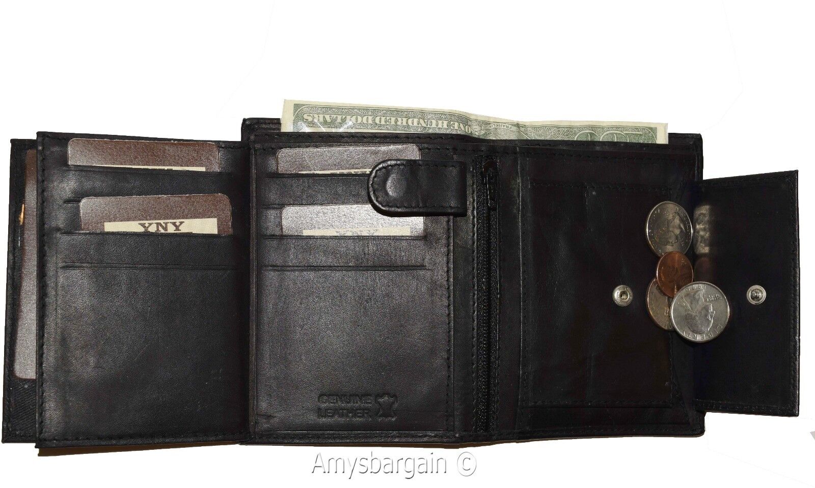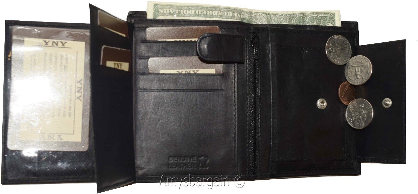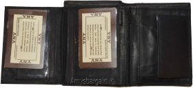 Description:This is a large very practical and durable genuine leather Bi-fold men's wallet. It offers a generous 10 credit card spaces, 2 bill fold pockets open for easy access. It also has 2 flip-side Snap-in-button pieces with 2 ID windows and a built-in change pocket.This wonderful large men's wallet would make a great gift item, or treat yourselves to it.Buy it now! it will not last at this price!Item Details:· Item: Men's large leather Wallet.· Material: genuine cowhide leather.· 2 Large billfold pockets open for easy access.· 10 Card slots.· 2 Flip-side Snap-in-button pieces with 2 ID windows.· 1 Built-in change purse.· 2 Under-card hidden card spaces.· Dimensions: (Closed): 4.75 x 3.75 inches.· Color: Black. View images please.·What's included? leather wallet. Bills, cards and other "Demo Items" are not included.Re-order number: Y69BY30.Manufacturers Suggested Retail Price (MSRP) $24.95 each.Buy it now it won't last.