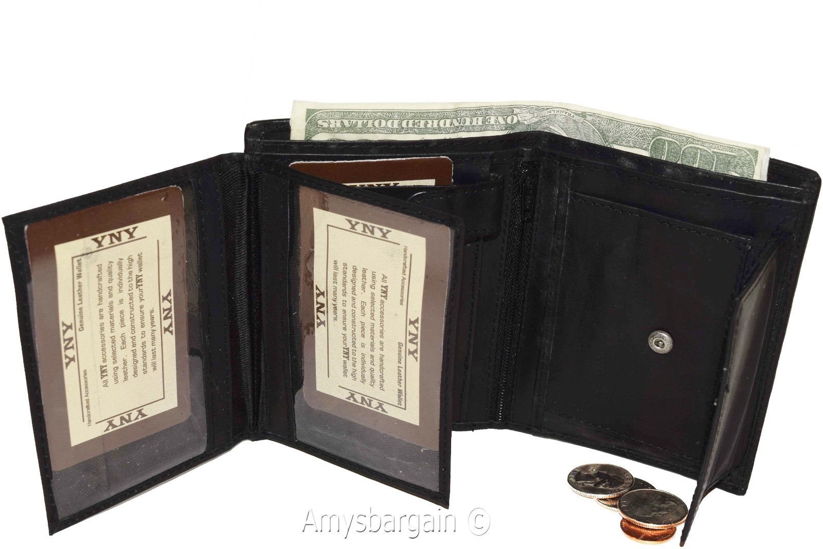 | Features | 2 Large Billfolds open for easy access., 8 Credit card spaces., 2 Coin cases; 1 zip and 1 with a snap closure., 3 Transparent ID windows. |