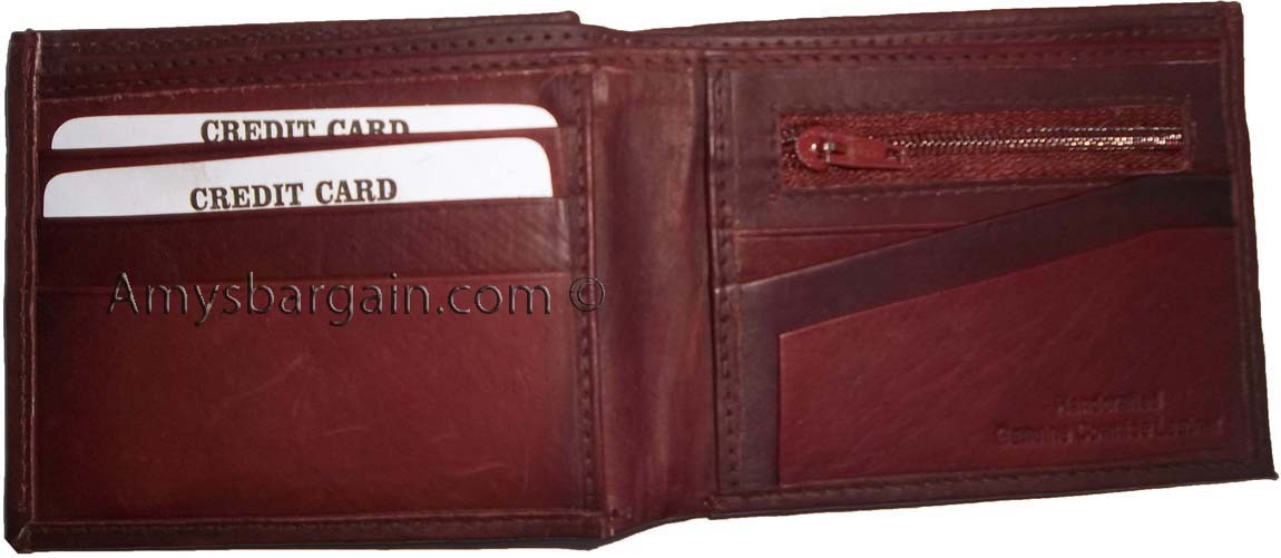 Description:This leather men's bi-fold wallet has 6 card spaces, a mini zip pocket and 2 suede lined billfolds.Act now! They won't last.Item Details: