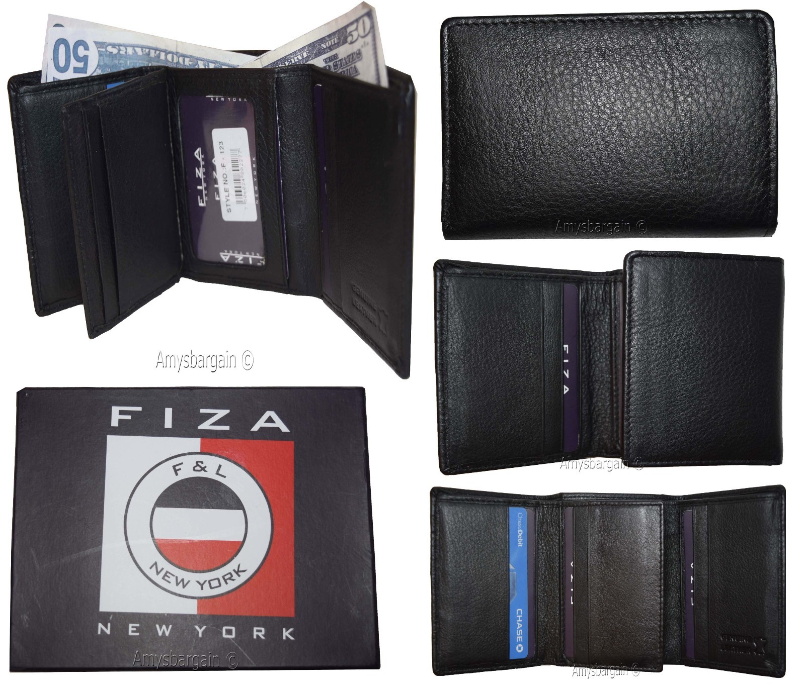 Men's Wallet Trifold wallet 9 Cards Billold FIZA NY Black Leather wallet in Box.Description:This Fiza NY soft natural grain leather trifold wallet is very stylish. It is well-made. It is made out of strong leather. This man's wallet has 2 large bill folds. This trifold wallet would make a great gift item, or, treat yourselves to it.It has 9 card spaces and 2 billfold pockets.The branding is only on the box and packaging not on the actual wallet.Act now! it won't last!Item Details: