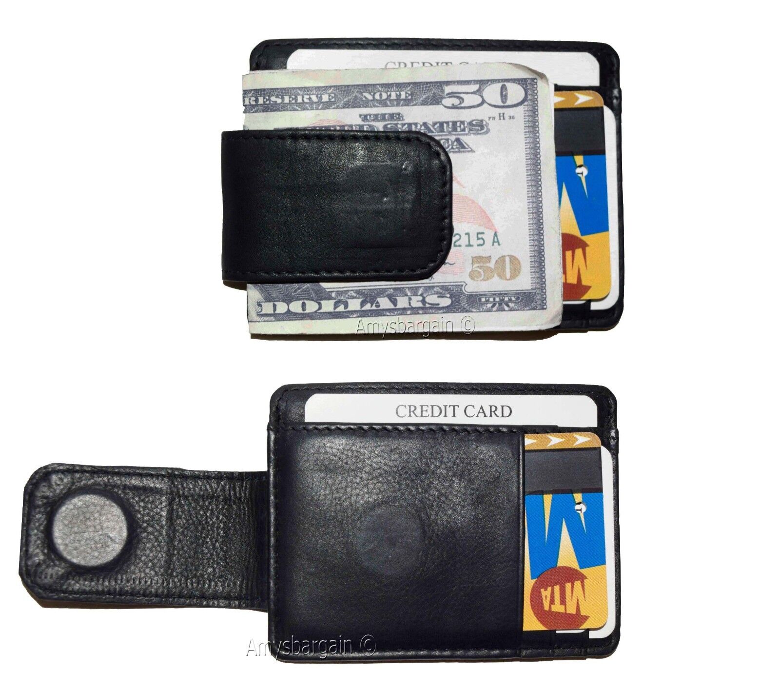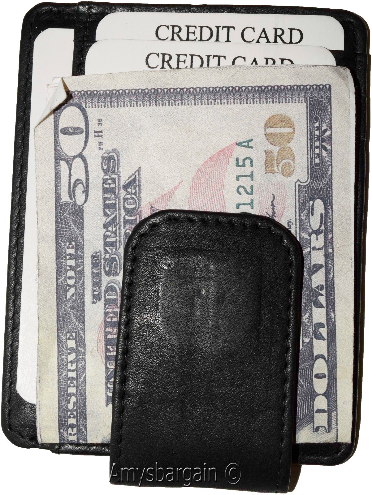 Money Clip, Leather Credit card ID money clip, wallet with magnetic money clip.Description:This stylish money clip wallet would make a great gift item or treat yourselves to it.Item Details:· It is made out of genuine cowhide leather.· 1 photo ID window display.· 3 Front credit card slots.· 1 Side credit card slot.· Magnetic money clip to hold cash for your convenience.· Size: 4 x 3 inches.· Color: Black.· Style #: mc48.·What's included? leather money clip. Bills, cards and other "Demo items" are not included.In store retail price $24.95 each.Buy it now it won't last!