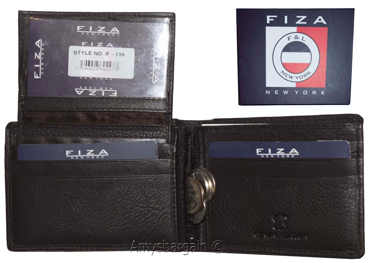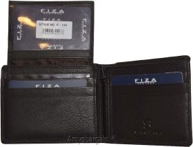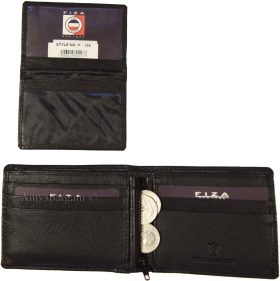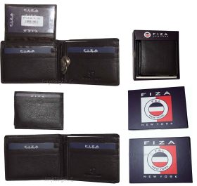 New FIZA NY Leather men's Bifold wallet Black 2 bill slots 2 ID zip coin case.Description:This natural grain Fiza NY wallet is very stylish. It is well-made. It is made out of strong natural grain leather. This men's wallet has a zip centered coin case. A flip-up detachable 2 ID windows and 3 credit card spaces. This wallet would make a great gift item, or, treat yourselves to it.It has 2 ID windows, 9 card spaces and 2 billfold pockets.Act now! it won't last!.Item Details: