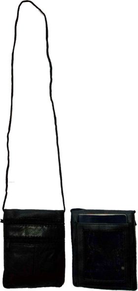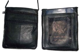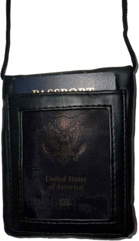 A nylon fish-net back pocket; transparent passport or ID window.