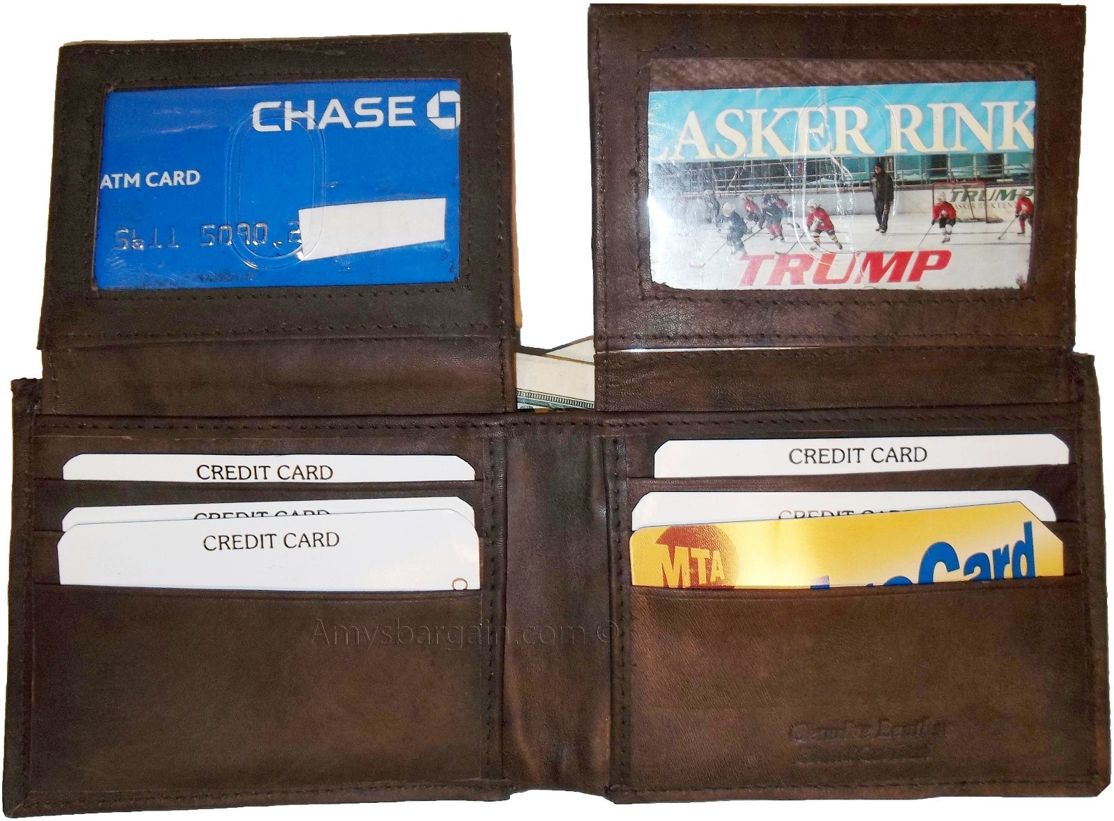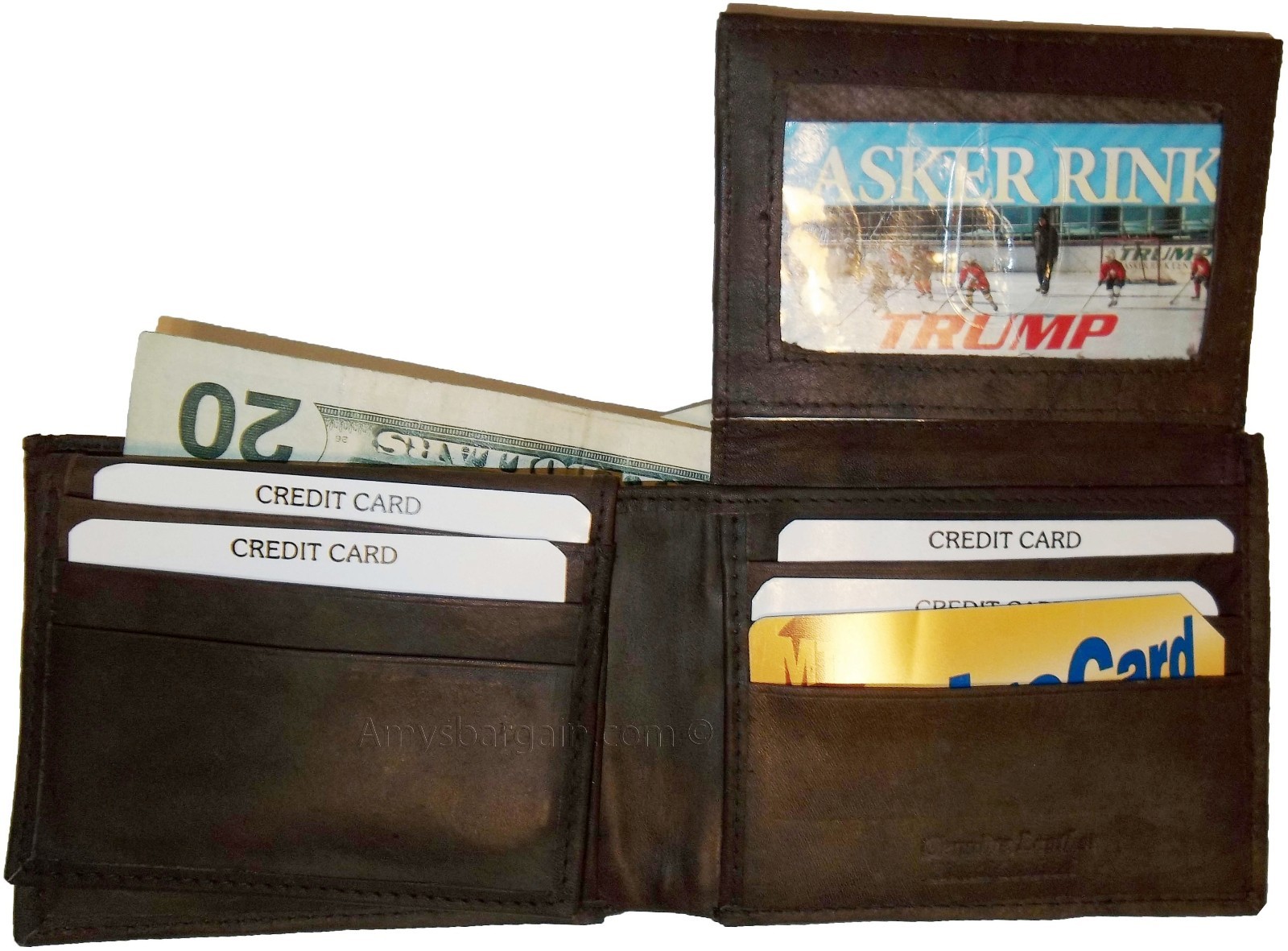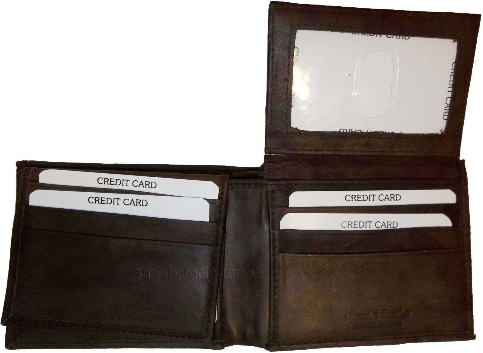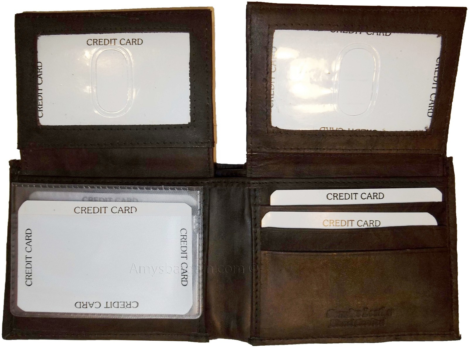 This wallet is made out of fine quality fine grain cowhide leather. This men's wallet has 2 easy in-and-out I'D windows, 12 card spaces and 2 suede lined billfold compartments.