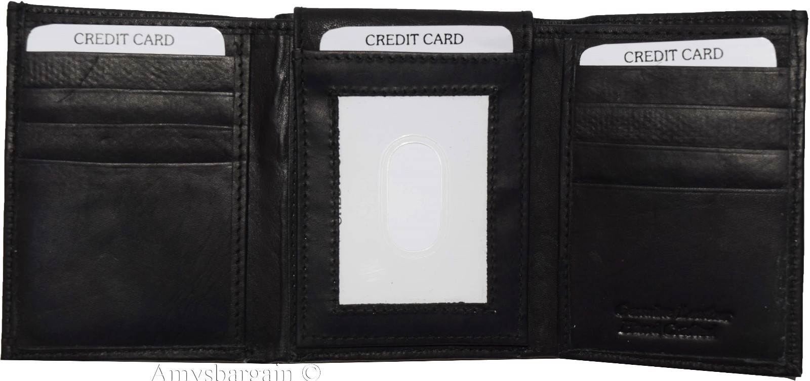 New Men's Trifold Leather Wallet 3 ID center piece Black 2 bill spaces wallet.