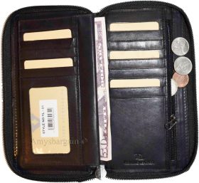 New Zip Around checkbook wallet Black 14 credit card zip change purse ID new.Description:This is a full size zip around compact leather wallet. It is made out of selected smooth cowhide. It offer a generous 14 card payload, 2 side spaces for inserting checkbooks, receipts or currencies. It also has a built in ID window.It's worth mentioning, that the checkbook case with 5 card slots and the ID is detachable.Act now! it will not last at this price!.Item Details: