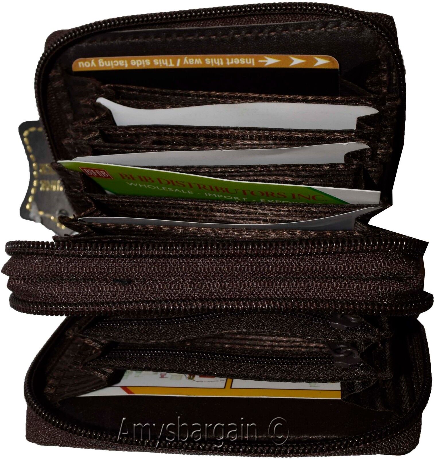 leather accordion wallet brown credit card holder 2 zipper purse wallet/